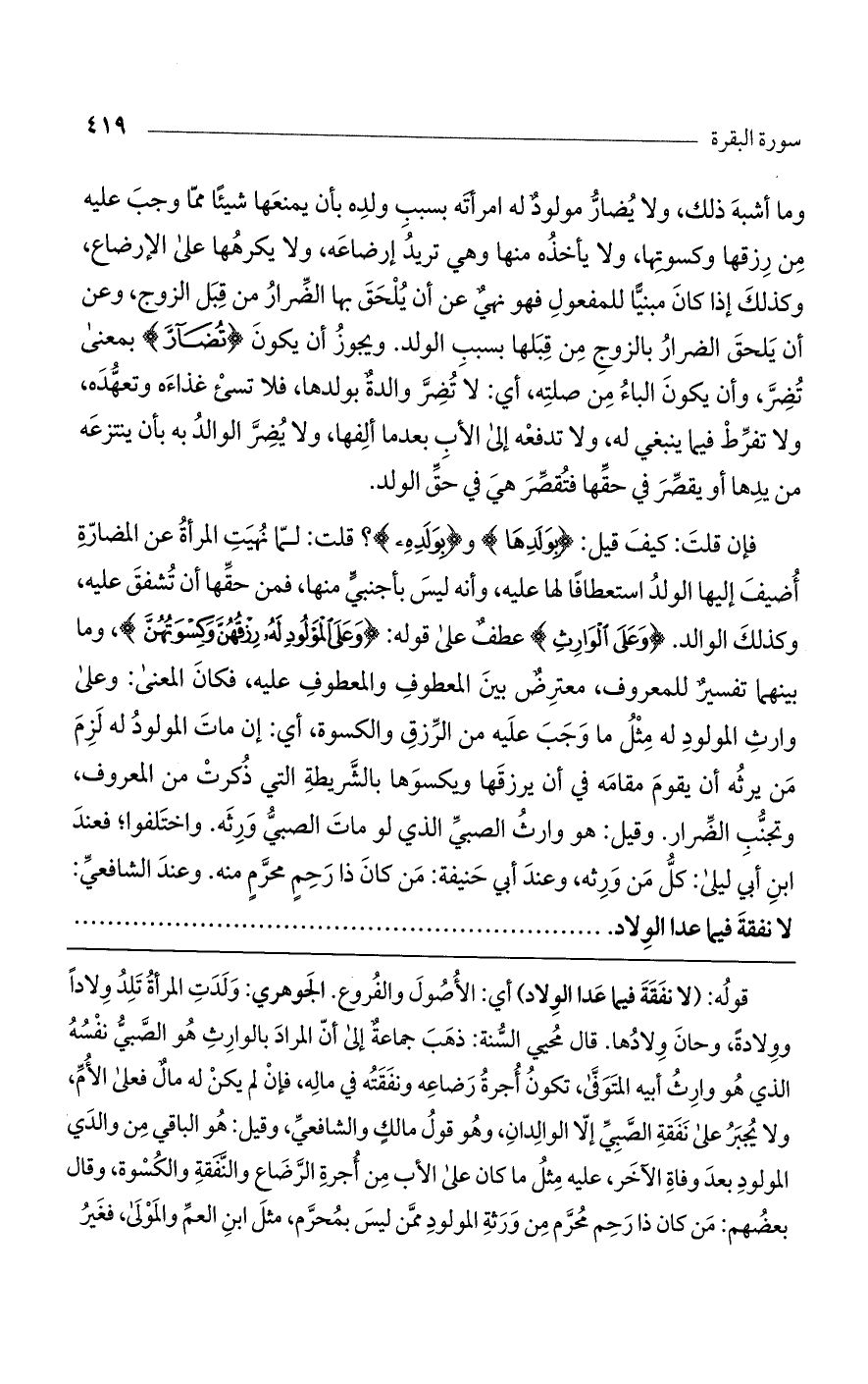 فان قلت: كيف قيل: (بولدها) و (بولده)؟ قلت: لما نهيت المرأة عن المضارة أضيف إليها الولد استعطافاً لها عليه، وأنه ليس بأجنبيّ منها، فمن حقها أن تشفق عليه، وكذلك الوالد. (وَعَلَى الْوارِثِ) عطف على قوله: (وَعَلَى الْمَوْلُودِ لَهُ رِزْقُهُنَّ وَكِسْوَتُهُنَّ)، وما بينهما تفسير للمعروف، معترض بين المعطوف والمعطوف عليه، فكان المعنى: وعلى وارث المولود له مثل ما وجب عليه من الرزق والكسوة، أي: إن مات المولود له لزم من يرثه أن يقوم مقامه في أن يرزقها ويكسوها بالشريطة التي ذكرت من المعروف، وتجنب الضرار. وقيل: هو وارث الصبي الذي لو مات الصبي ورثه. واختلفوا؛ فعند ابن أبي ليلى: كل من ورثه، وعند أبي حنيفة: من كان ذا رحمٍ محرمٍ منه. وعند الشافعي: لا نفقة فيما عدا الولاد