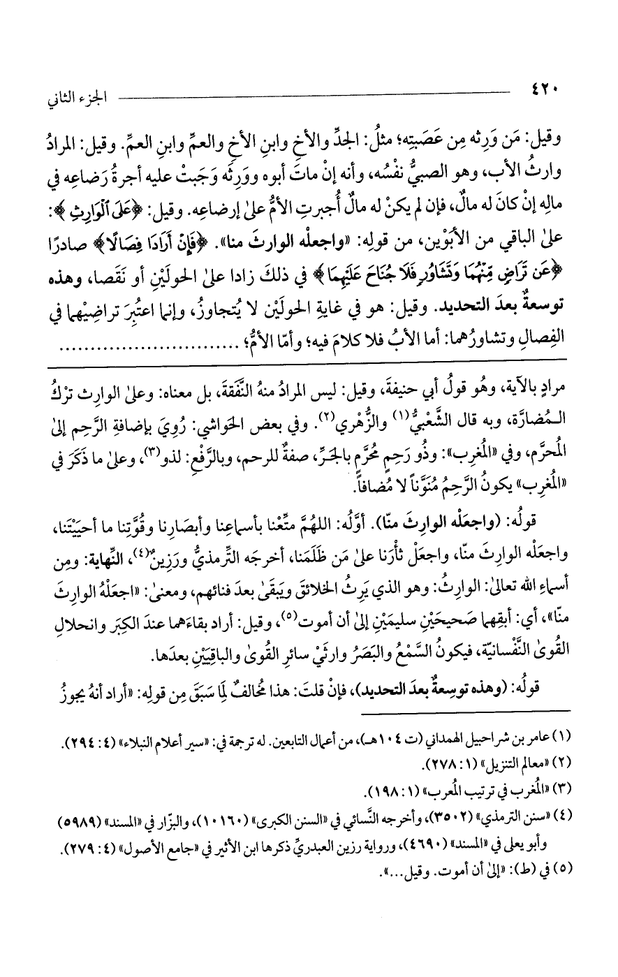 مراد بالآية، وهو قول أبي حنيفة، وقيل: ليس المراد منه النفقة، بل معناه: وعلى الوارث ترك المضارة، وبه قال الشعبي والزهري. وفي بعض الحواشي: روي بإضافة الرحم إلى المحرم، وفي "المغرب": وذو رحم محرم بالجر، صفة للرحم، وبالرفع: لذو، وعلى ما ذكر في "المغرب" يكون الرحم منوناً لا مضافاً.
