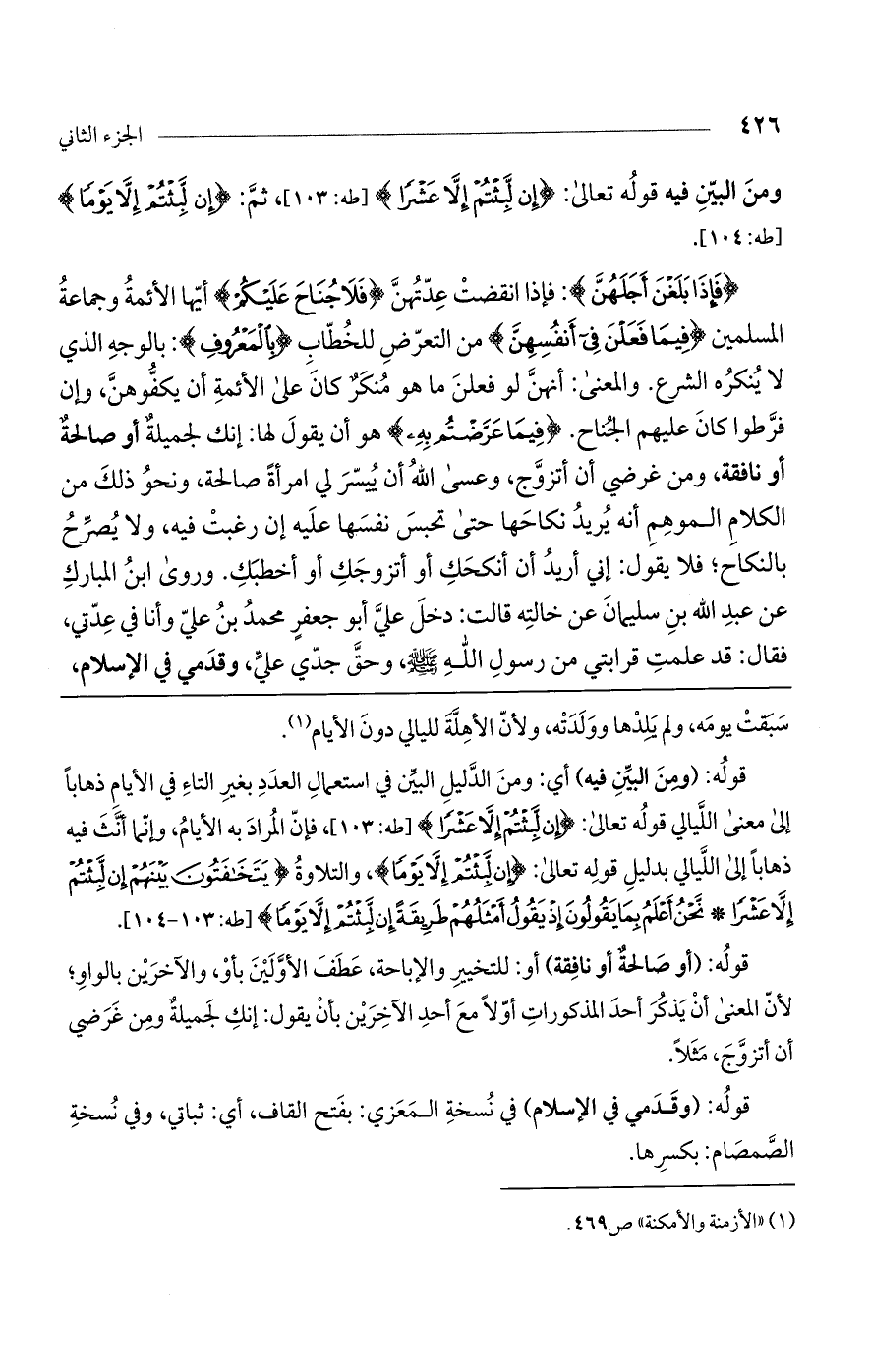 قوله: (ومن البين فيه) أي: ومن الدليل البين في استعمال العدد بغير التاء في الأيام ذهاباً إلى معنى الليالي قوله تعالى: (إِنْ لَبِثْتُمْ إِلاَّ عَشْراً) [طه: 103]، فإن المراد به الأيام، وإنما أنث فيه ذهاباً إلى الليالي بدليل قوله تعالى: (إِنْ لَبِثْتُمْ إِلاَّ يَوْماً)، والتلاوة (يَتَخَافَتُونَ بَيْنَهُمْ إِنْ لَبِثْتُمْ إِلاَّ عَشْراً* نَحْنُ أَعْلَمُ بِمَا يَقُولُونَ إِذْ يَقُولُ أَمْثَلُهُمْ طَرِيقَةً إِنْ لَبِثْتُمْ إِلاَّ يَوْماً) [طه: 103 - 104].