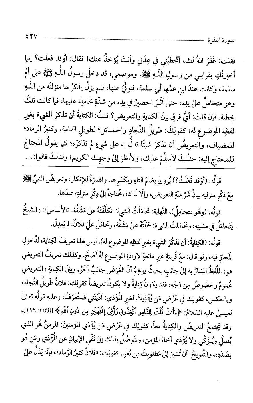 فقلت: غفر اللَّه لك، أتخطبني في عدّتي وأنت يؤخذ عنك! فقال: أوقد فعلت؟ إنما أخبرتك بقرابتي من رسول اللَّه صلى اللَّه عليه وسلم، وموضعي، قد دخل رسول اللَّه صلى اللَّه عليه وسلم على أم سلمة، وكانت عند ابن عمها أبي سلمة، فتوفي عنها، فلم يزل يذكر لها منزلته من اللَّه وهو متحامل على يده، حتى أثر الحصير في يده من شدّة تحامله عليها، فما كانت تلك خطبة. فإن قلت: أي: فرق بين الكناية والتعريض؟ قلت: الكناية أن تذكر الشيء بغير لفظه الموضوع له؛ كقولك: طويل النجاد والحمائل؛ لطول القامة، وكثير الرماد؛ للمضياف، والتعريض أن تذكر شيئاً تدل به على شيء لم تذكره؛ كما يقول المحتاج للمحتاج إليه: جئتك لأسلم عليك، ولأنظر إلى وجهك الكريم؛ ولذلك قالوا: