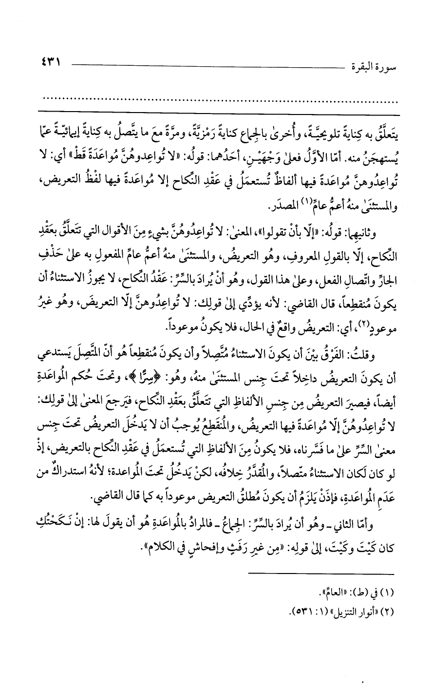 وقلت: الفرق بين أن يكون الاستثناء متصلاً وأن يكون منقطعاً هو أن المتصل يستدعي أن يكون التعريض داخلاً تحت جنس المستثنى منه، وهو: (سِرّاً)، وتحت حكم المواعدة ايضاً، فيصير التعريض من جنس الألفاظ التي تتعلق بعقد النكاح، فيرجع المعنى إلى قولك: لا تواعدوهن إلا مواعدة فيها التعريض، والمنقطع يوجب أن لا يدخل التعريض تحت جنس معنى السر على ما فسرناه، فلا يكون من الألفاظ التي تستعمل في عقد النكاح بالتعريض، إذ لو كان لكان الاستثناء متصلاً، والمقدر خلافه، لكن يدخل تحت المواعدة؛ لأنه استدراك من عدم المواعدة، فإذن يلزم أن يكون مطلق التعريض موعوداً به كما قال القاضي.