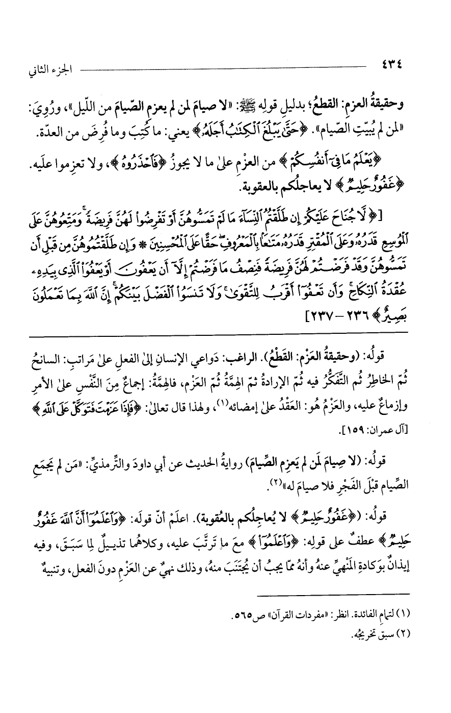 وحقيقة العزم: القطع؛ بدليل قوله صلى الله عليه وسلم: «لا صيام لمن لم يعزم الصيام من الليل» وروي: «لمن لم يبيت الصيام». (حَتَّى يَبْلُغَ الْكِتابُ أَجَلَهُ) يعني: ما كتب وما فرض من العدّة.