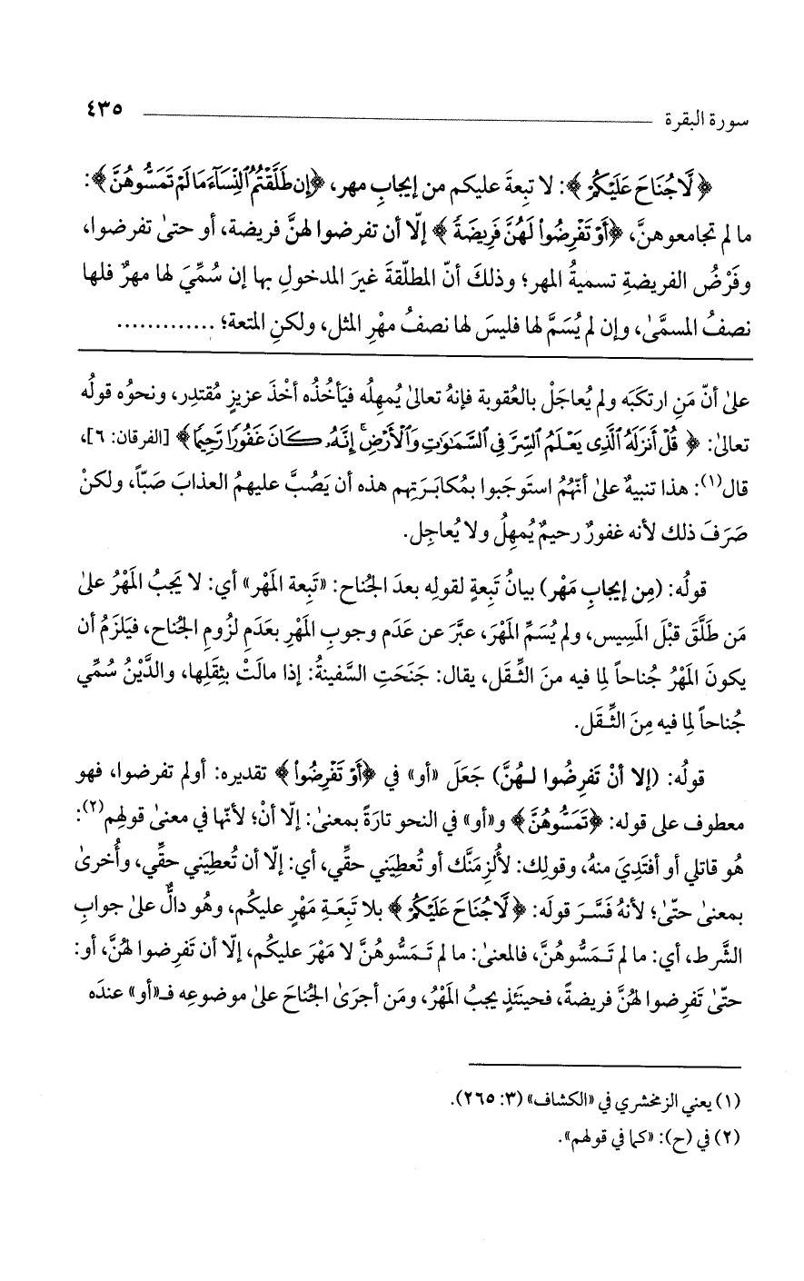 (لا جُناحَ عَلَيْكُمْ): لا تبعة عليكم من إيجاب مهر، (إِنْ طَلَّقْتُمُ النِّساءَ ما لَمْ تَمَسُّوهُنَّ): ما لم تجامعوهنّ، (أَوْ تَفْرِضُوا لَهُنَّ فَرِيضَةً) إلا أن تفرضوا لهن فريضة، أو حتى تفرضوا، وفرض الفريضة تسمية المهر؛ وذلك أن المطلقة غير المدخول بها إن سمي لها مهر فلها نصف المسمى، وإن لم يسم لها فليس لها نصف مهر المثل ولكن المتعة؛ .....