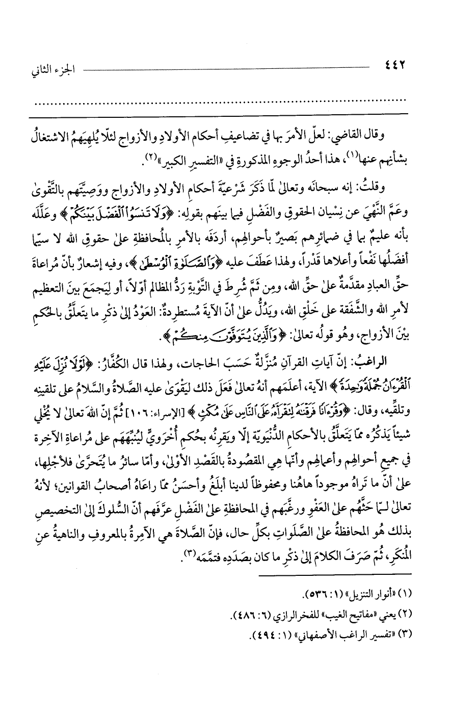 الراغب: إن آيات القرآن منزلة حسب الحاجات، ولهذا قال الكفار: (لَوْلا نُزِّلَ عَلَيْهِ الْقُرْآنُ جُمْلَةً وَاحِدَةً) الآية، أعلمهم أنه تعالى فعل ذلك ليقوى عليه الصلاة والسلام على تلقينه وتلقيه، وقال: (وَقُرْآناً فَرَقْنَاهُ لِتَقْرَأَهُ عَلَى النَّاسِ عَلَى مُكْثٍ) [الإسراء: 106] ثم إن الله تعالى لا يخلي شيئاً يذكره مما يتعلق بالأحكام الدنيوية إلا ويقرنه بحكم أخروي لينبههم على مراعاة الآخرة في جميع أحوالهم وأعمالهم وأنها هي المقصودة بالقصد الأولى، وأما سائر ما يتحرى فلأجلها، على أن ما تراه موجوداً ها هنا ومحفوظاً لدينا أبلغ وأحسن مما راعاه أصحاب القوانين؛ لأنه تعالى لما حثهم على العفو ورغبهم في المحافظة على الفضل عرفهم أن السلوك إلى التخصيص بذلك هو المحافظة على الصلوات بكل حال، فإن الصلاة هي الآمرة بالمعروف والناهية عن المنكر، ثم صرف الكلام إلى ذكر ما كان بصدده فتممه.