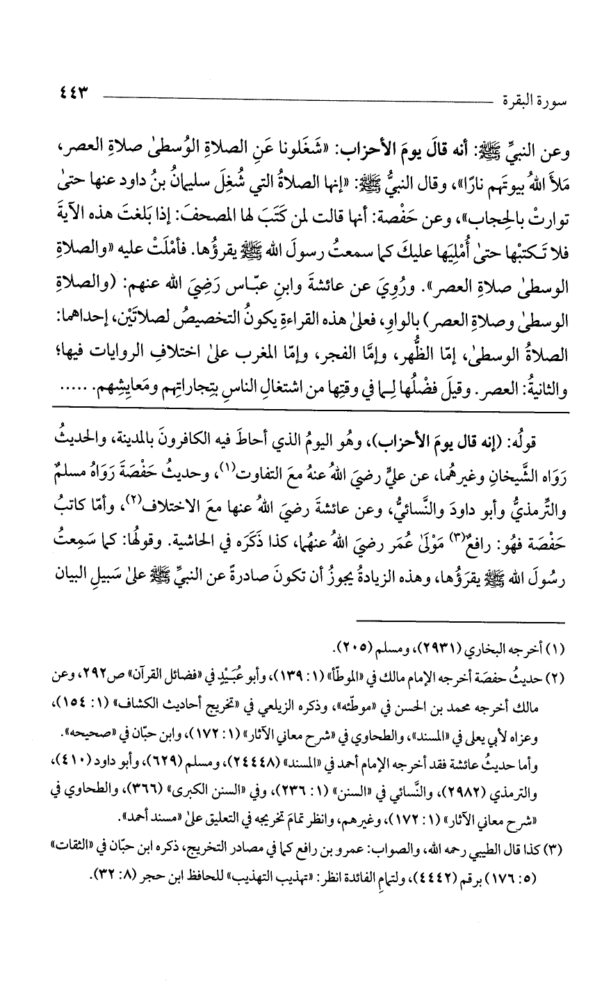 قوله: (إنه قال يوم الأحزاب)، وهو اليوم الذي أحاط فيه الكافرون بالمدينة، والحديث رواه الشيخان وغيرهما، عن علي رضي الله عنه مع التفاوت، وحديث حفصة رواه مسلم والترمذي وأبو داود والنسائي، وعن عائشة رضي الله عنها مع الاختلاف، وأما كاتب حفصة فهو: رافع مولى عمر رضي الله عنهما، كذا ذكره في الحاشية. وقولها: كما سمعت رسول الله صلى الله عليه وسلم يقرؤها، وهذه الزيادة يجوز أن تكون صادرة عن النبي صلى الله عليه وسلم على سبيل البيان