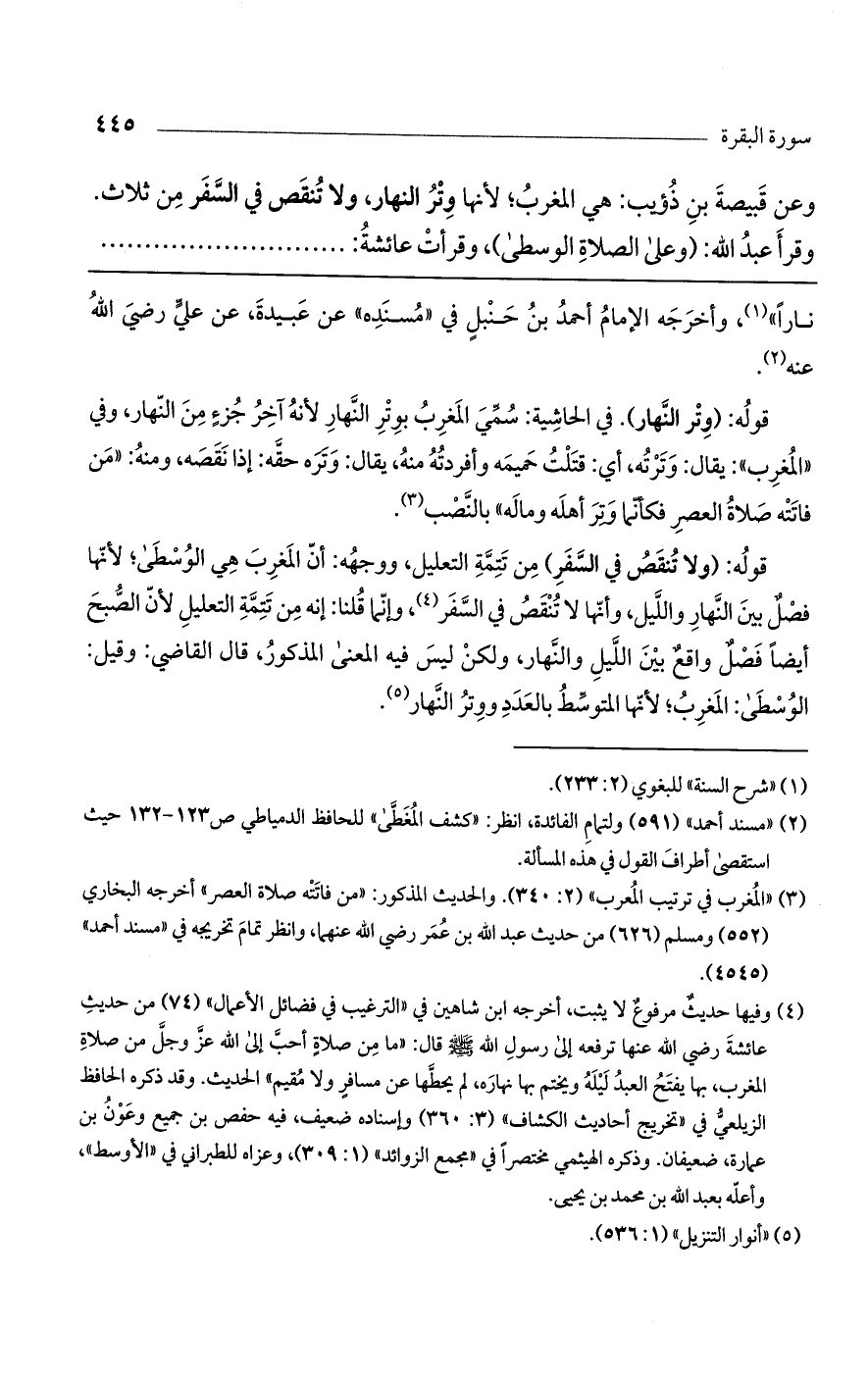 وعن قبيصة بن ذؤيب: هي المغرب، لأنها وتر النهار، ولا تنقص في السفر من ثلاث. وقرأ عبد اللَّه: (وعلى الصلاة الوسطى)، وقرأت عائشة:
