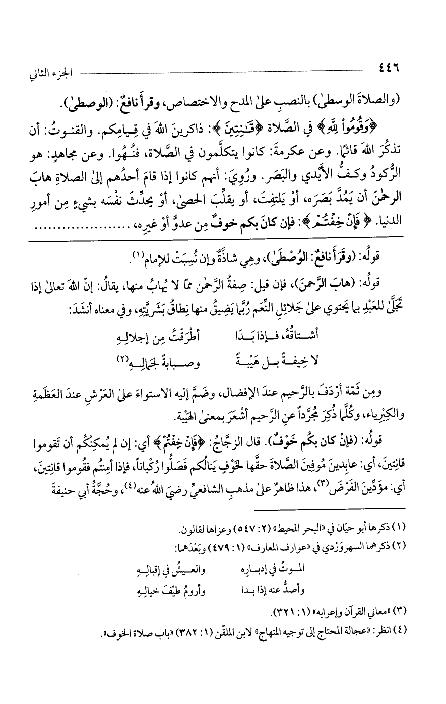 (وَقُومُوا لِلَّهِ) في الصلاة (قانِتِينَ): ذاكرين للَّه في قيامكم. والقنوت: أن تذكر اللَّه قائماً. وعن عكرمة: كانوا يتكلمون في الصلاة، فنهوا. وعن مجاهدٍ: هو الركود وكف الأيدى والبصر. وروي: أنهم كانوا إذا قام أحدهم إلى الصلاة هاب الرحمن أن يمدّ بصره، أو يلتفت، أو يقلب الحصى، أو يحدّث نفسه بشيء من أمور الدنيا. (فَإِنْ خِفْتُمْ): فإن كان بكم خوف من عدوّ أو غيره،