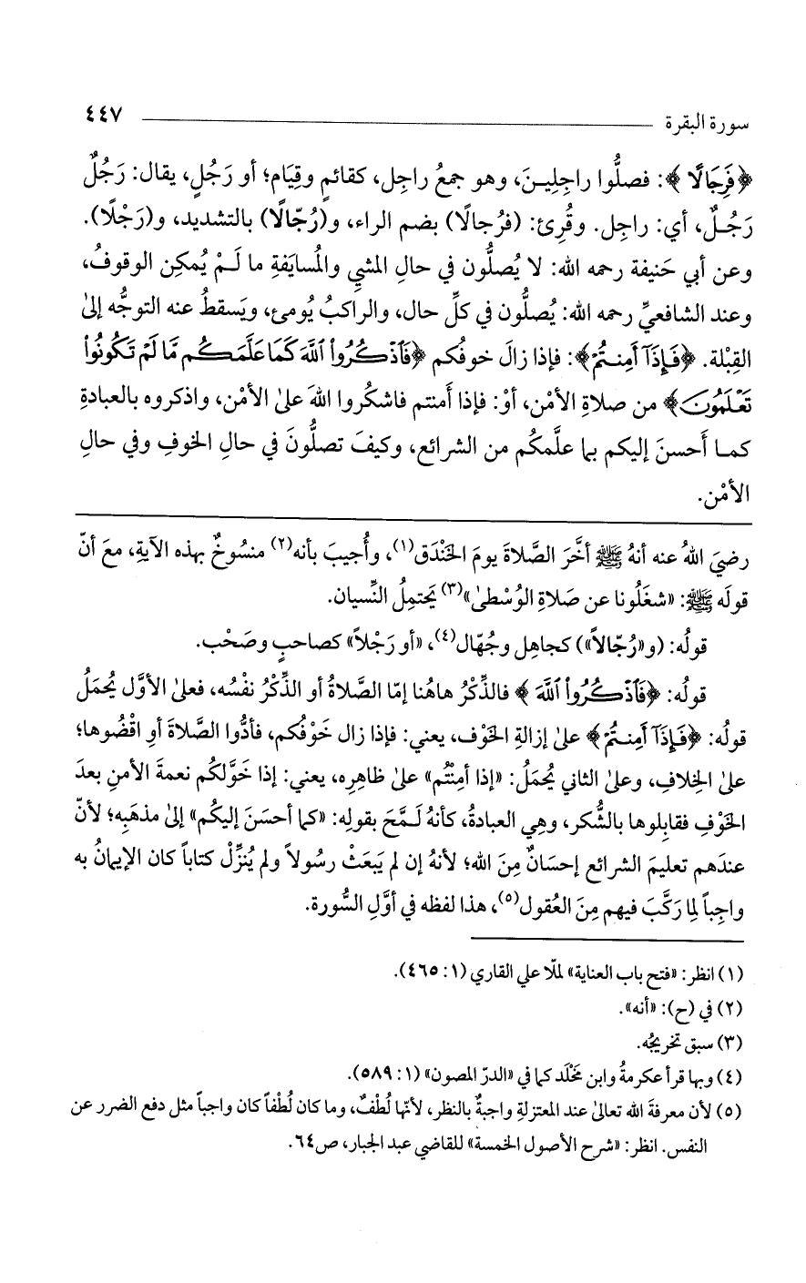 (فَرِجالًا): فصلوا راجلين، وهو جمع راجل كقائم وقيام؛ أو رجلٍ، يقال: رجل رجل، أي: راجل. وقرئ: (فرجالاً) بضم الراء، و (رجالاً) بالتشديد، و (رجلاً). وعند أبي حنيفة رحمه اللَّه: لا يصلون في حال المشي والمسايفة ما لم يمكن الوقوف، وعند الشافعي رحمه اللَّه: يصلون في كل حال، والراكب يومئ، ويسقط عنه التوجه إلى القبلة (فَإِذا أَمِنْتُمْ): فإذا زال خوفكم (فَاذْكُرُوا اللَّهَ كَما عَلَّمَكُمْ ما لَمْ تَكُونُوا تَعْلَمُونَ) من صلاة الأمن، أو: فإذا أمنتم فاشكروا اللَّه على الأمن، واذكروه بالعبادة كما أحسن إليكم بما علمكم من الشرائع، وكيف تصلون في حال الخوف وفي حال الأمن.