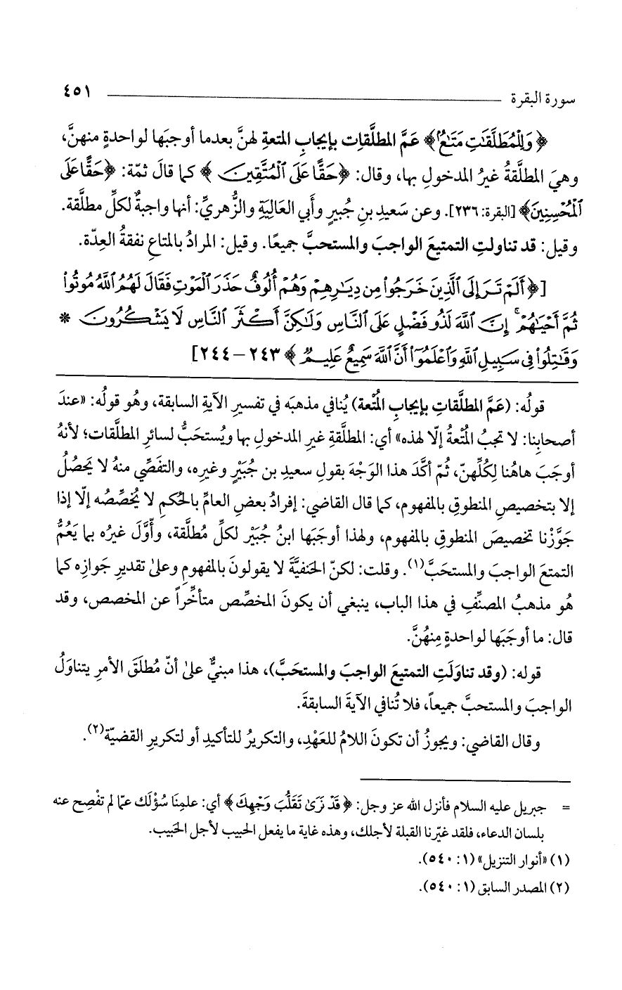 قوله: (عَمَّ المطلقات بإيجاب المتعة) ينافي مذهبه في تفسير الآية السابقة، وهو قوله: "عند أصحابنا: لا تجب المتعة إلا لهذه" أي: المطلقة غير المدخول بها ويستحب لسائر المطلقات؛ لأنه أوجب ها هنا لكلهن، ثم أكد هذا الوجه بقول سعيد بن جبير وغيره، والتفصي منه لا يحصل إلا بتخصيص المنطوق بالمفهوم، كما قال القاضي: إفراد بعض العام بالحكم لا يخصصه إلا إذا جوزنا تخصيص المنطوق بالمفهوم، ولهذا أوجبها ابن جبير لكل مطلقة، وأول غيره بما يعم التمتع الواجب والمستحب. وقلت: لكن الحنفية لا يقولون بالمفهوم وعلى تقدير جوازه كما هو مذهب المصنف في هذا الباب، ينبغي أن يكون المخصص متأخراً عن المخصص، وقد قال: ما أوجبها لواحدة منهن.