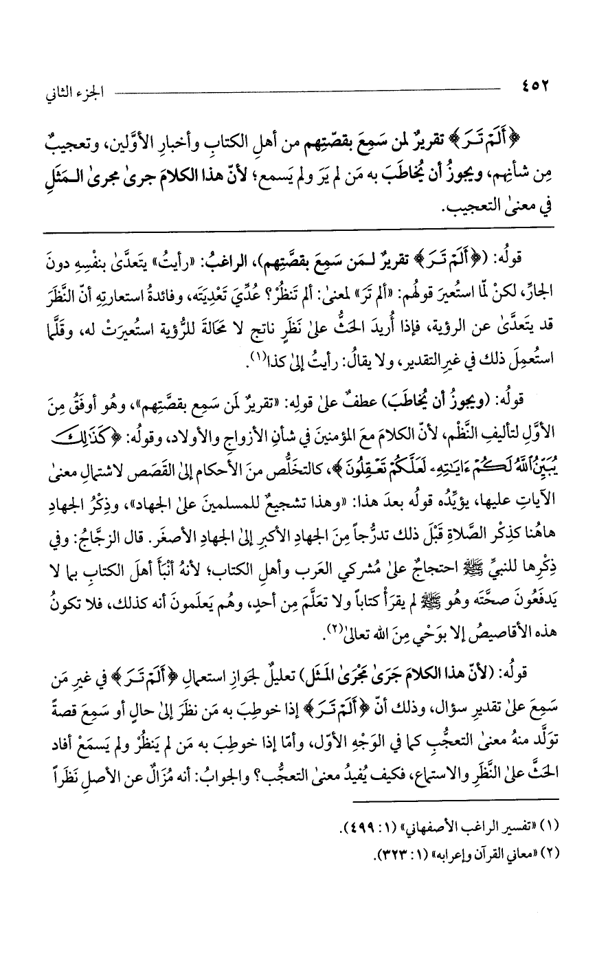قوله: (لأن هذا الكلام جرى مجرى المثل) تعليل لجواز استعمال (أَلَمْ تَرَ) في غير من سمع على تقدير سؤال، وذلك أن (أَلَمْ تَرَ) إذا خوطب به من نظر إلى حال أو سمع قصة تولد منه معنى التعجب كما في الوجه الأول، وأما إذا خوطب به من لم ينظر ولم يسمع افاد الحث على النظر والاستماع، فكيف يفيد معنى التعجب؟ والجواب: أنه مزال عن الأصل نظراً
