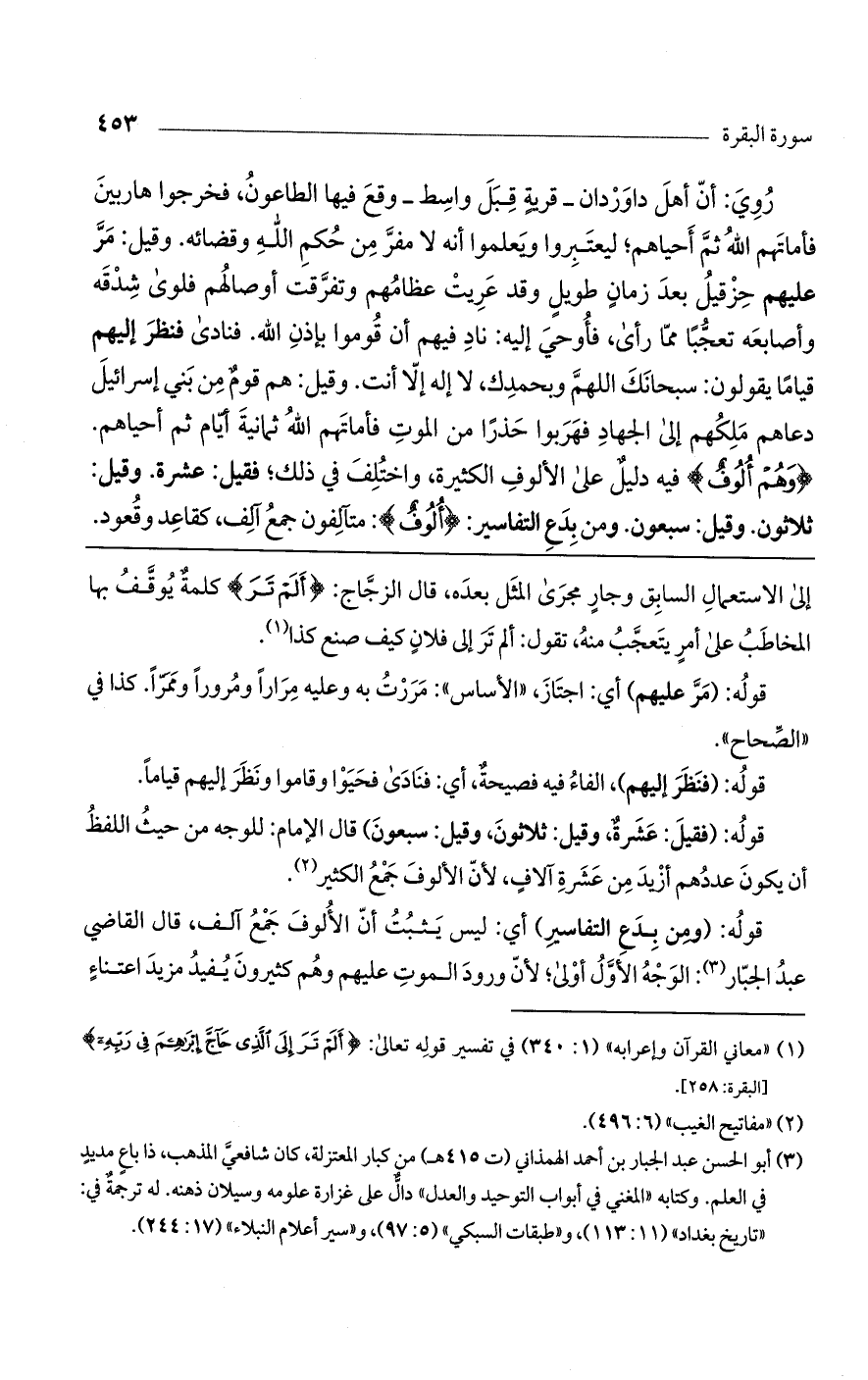 روي: أنّ أهل داوردان قرية قبل واسط -وقع فيهم الطاعون، فخرجوا هاربين فأماتهم اللَّه ثم أحياهم؛ ليعتبروا ويعلموا أنه لا مفرّ من حكم اللَّه وقضائه. وقيل: مرّ عليهم حزقيل بعد زمان طويل وقد عريت عظامهم وتفرّقت أوصالهم فلوى شدقه وأصابعه تعجباً مما رأى، فأوحي إليه: ناد فيهم أن قوموا بإذن اللَّه. فنادى فنظر إليهم قياماً يقولون: سبحانك اللهم وبحمدك لا إله إلا أنت. وقيل: هم قوم من بني إسرائيل دعاهم ملكهم إلى الجهاد فهربوا حذراً من الموت، فأماتهم اللَّه ثمانية أيام ثم أحياهم. (وَهُمْ أُلُوفٌ) فيه دليل على الألوف الكثيرة، واختلف في ذلك؛ فقيل: عشرة، وقيل: ثلاثون، وقيل: سبعون. ومن بدع التفاسير: (أُلُوفٌ): متآلفون جمع آلف، كقاعد وقعود.