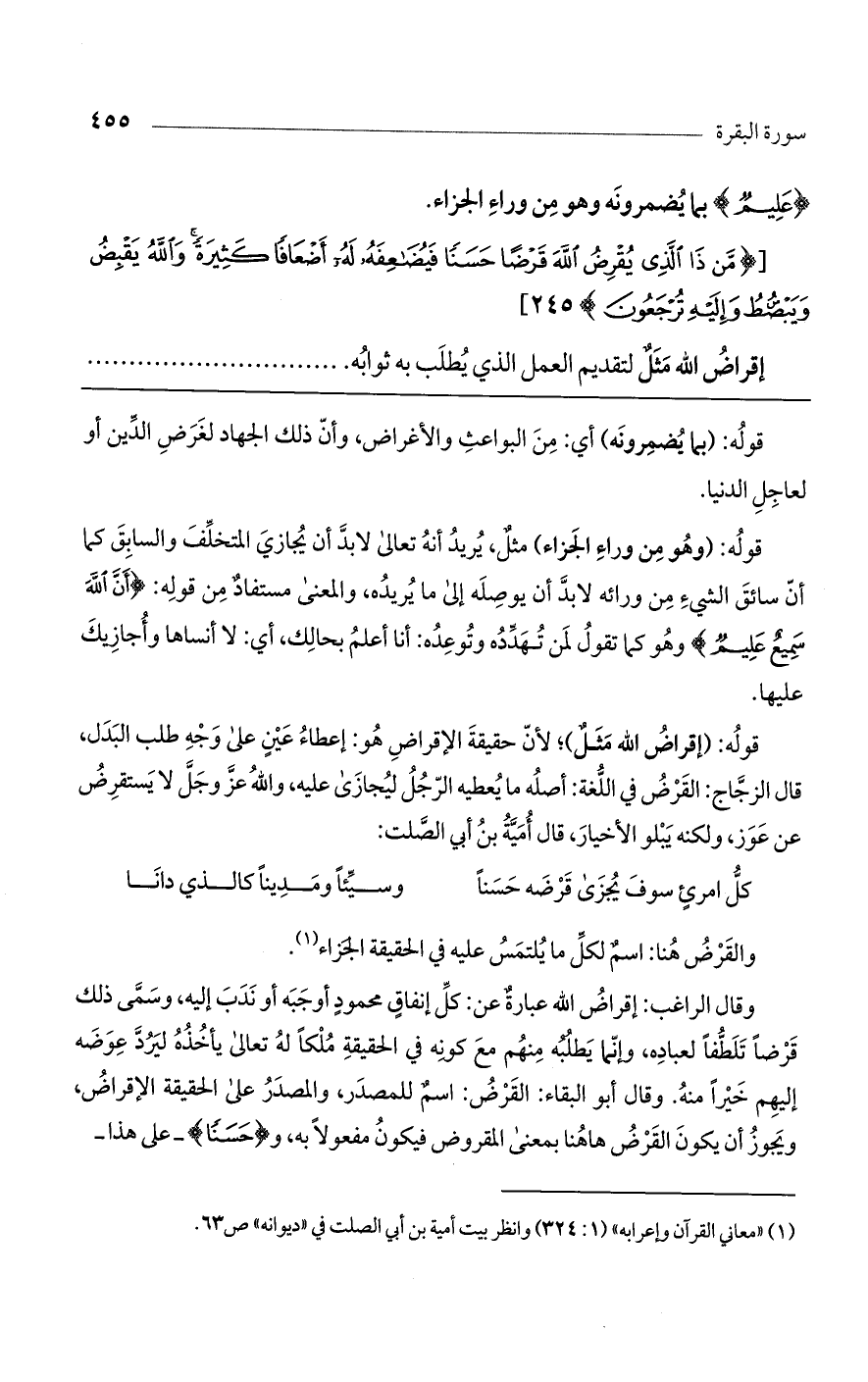 قوله: (إقراض الله مثل)؛ لأن حقيقة الإقراض هو: إعطاء عين على وجه طلب البدل، قال الزجاج: القرض في اللغة: أصله ما يعطيه الرجل ليجازى عليه، والله عز وجل لا يستقرض عن عوز، ولكنه يبلو الأخيار، قال أمية بن أبي الصلت: