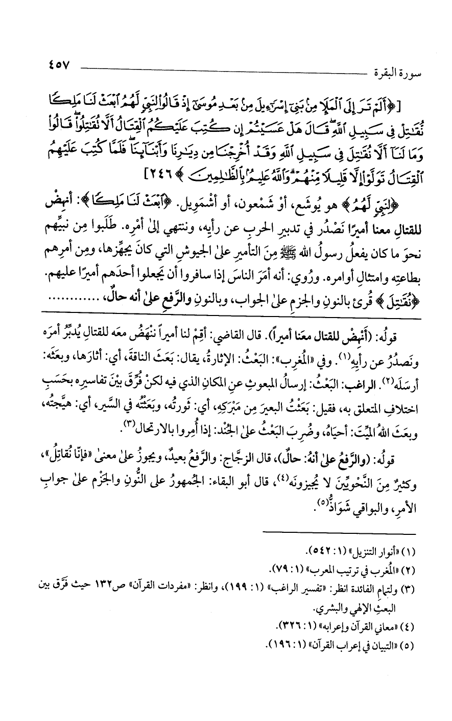 قوله: (أنهض للقتال معنا أميراً). قال القاضي: أقم لنا أميراً ننهض معه للقتال يدبر أمره ونصدر عن رأيه. وفي "المغرب": البعث: الإثارة، يقال: بعث الناقة، أي: أثارها، وبعثه: أرسله. الراغب: البعث: إرسال المبعوث عن المكان الذي فيه لكن فرق بين تفاسيره بحسب اختلاف المتعلق به، فقيل: بعثت البعير من مبركه، أي: ثورته، وبعثته في السير، أي: هيجته، وبعث الله الميت: أحياه، وضرب البعث على الجند: إذا أمروا بالارتحال.