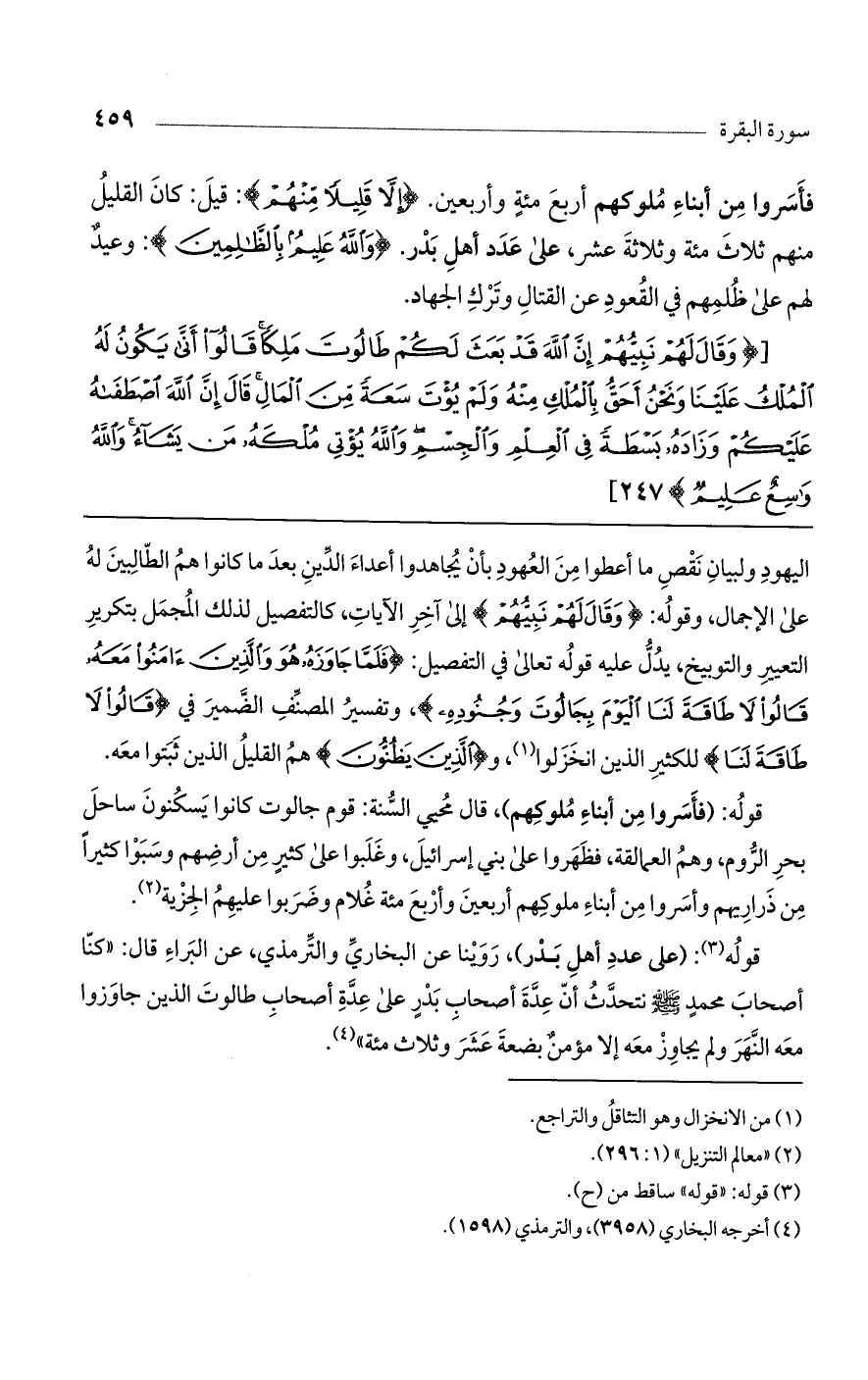قوله: (فأسروا من أبناء ملوكهم)، قال محيي السنة: قوم جالوت كانوا يسكنون ساحل بحر الروم، وهم العمالقة، فظهروا على بني إسرائيل، وغلبوا على كثير من أرضهم وسبوا كثيراً من ذراريهم وأسروا من أبناء ملوكهم أربعين وأربع مئة غلام وضربوا عليهم الجزية.
