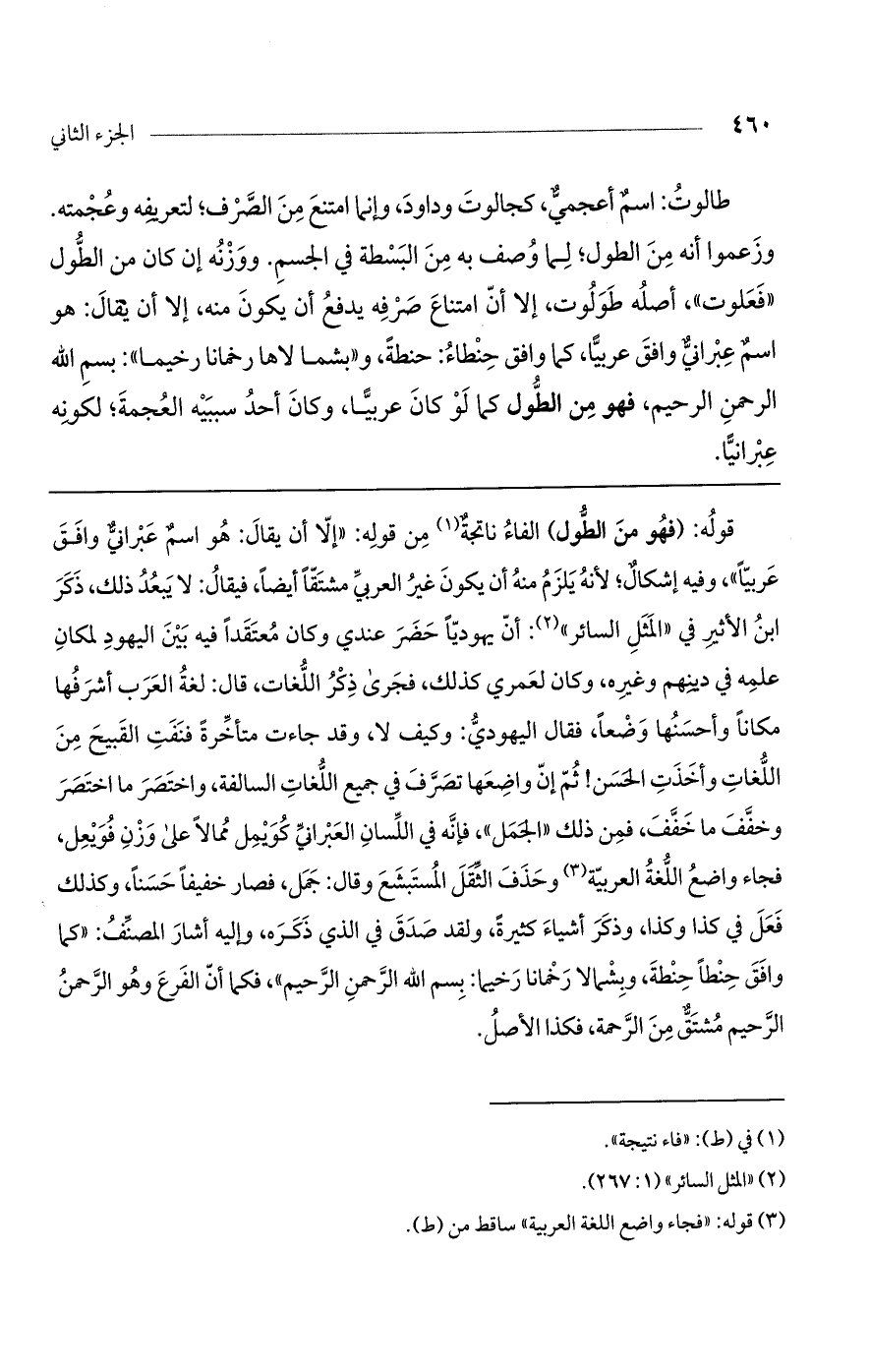 قوله: (فهو من الطول) الفاء ناتجة من قوله: "إلا أن يقال: هو اسم عبراني وافق عربياً"، وفيه إشكال؛ لأنه يلزم منه أن يكون غير العربي مشتقاً أيضاً، فيقال: لا يبعد ذلك، ذكر ابن الأثير في "المثل السائر": أن يهودياً حضر عندي وكان معتقداً فيه بين اليهود لمكان علمه في دينهم وغيره، وكان لعمري كذلك، فجرى ذكر اللغات، قال: لغة العرب أشرفها مكاناً وأحسنها وضعاً، فقال اليهودي: وكيف لا، وقد جاءت متأخرة فنفت القبيح من اللغات وأخذت الحسن! ثم إن واضعها تصرف في جميع اللغات السالفة، واختصر ما اختصر وخفف ما خفف، فمن ذلك "الجمل"، فإنه في اللسان العبراني كويمل ممالاً على وزن فويعل، فجاء واضع اللغة العربية وحذف الثقل المستبشع وقال: جمل، فصار خفيفاً حسناً، وكذلك فعل في كذا وكذا، وذكر أشياء كثيرة، ولقد صدق في الذي ذكره، وإليه أشار المصنف: "كما وافق حنطاً حنطة، وبشمالا رخمانا رخيما: بسم الله الرحمن الرحيم"، فكما أن الفرع وهو الرحمن الرحيم مشتق من الرحمة، فكذا الأصل.