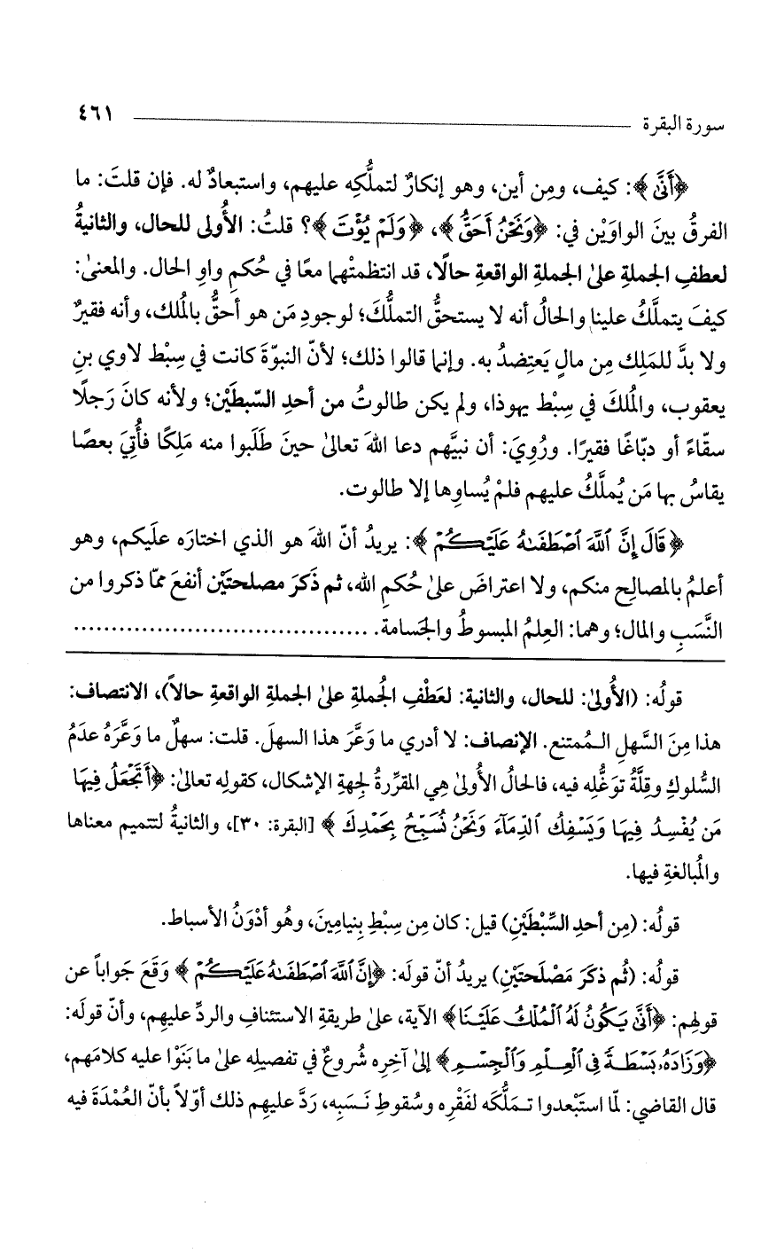 قوله: (ثم ذكر مصلحتين) يريد أن قوله: (إِنَّ اللَّهَ اصْطَفَاهُ عَلَيْكُمْ) وقع جواباً عن قولهم: (أَنَّى يَكُونُ لَهُ الْمُلْكُ عَلَيْنَا) الآية، على طريقة الاستئناف والرد عليهم، وأن قوله: (وَزَادَهُ بَسْطَةً فِي الْعِلْمِ وَالْجِسْمِ) على آخره شروع في تفصيله على ما بنوا عليه كلامهم، قال القاضي: لما استبعدوا تملكه لفقره وسقوط نسبه، رد عليهم ذلك أولاً بأن العمدة فيه