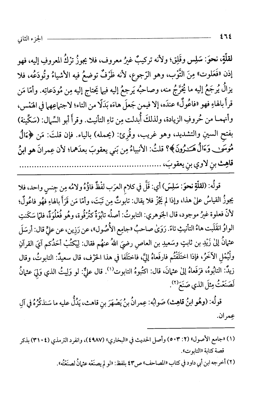 لقلةٍ، نحو: سلس وقلق، ولأنه تركيب غير معروف فلا يجوز ترك المعروف إليه، فهو إذاً «فعلوت» من التوب، وهو الرجوع لأنه ظرف توضع فيه الأشياء وتودعه، فلا يزال يرجع إليه ما يخرج منه، وصاحبه يرجع إليه فيما يحتاج إليه من مودعاته. وأمّا من قرأ بالهاء فهو «فاعول» عنده، إلا فيمن جعل هاءه بدلاً من التاء، لاجتماعهما في الهمس، وأنهما من حروف الزيادة، ولذلك أبدلت من تاء التأنيث. وقرأ أبو السمال: (سكينة) بفتح السين والتشديد وهو غريب. وقرئ: (يحمله) بالياء. فإن قلت: مَن (آلُ مُوسى وَآلُ هارُونَ)؟ قلت: الأنبياء من بنى يعقوب بعدهما؛ لأن عمران هو ابن قاهث بن لاوي بن يعقوب،