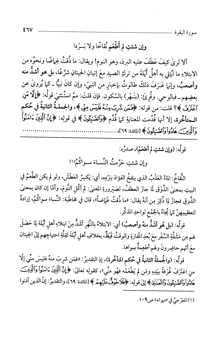 ألا ترى كيف عطف عليه البرد وهو النوم! ويقال: ما ذقت غماضاً ونحوه من الابتلاء ما ابتلي اللَّه به أهل أيلة من ترك الصيد مع إتيان الحيتان شرَّعاً، بل هو أشد منه وأصعب، وإنما عرف ذلك طالوت بإخبار من النبي، وإن كان نبياً - كما يروى عن بعضهم - فبالوحي. وقرئ: (بنهر) بالسكون. فإن قلت: ممَّ استثنى قوله: (إِلَّا مَنِ اغْتَرَفَ)؟ قلت: من قوله: (فَمَنْ شَرِبَ مِنْهُ فَلَيْسَ مِنِّي)، والجملة الثانية في حكم المتأخرة، إلا أنها قدّمت للعناية كما قدم (وَالصَّابِئُونَ) في قوله: (إِنَّ الَّذِينَ آمَنُوا وَالَّذِينَ هادُوا وَالصَّابِئُونَ) [المائدة: 69]،