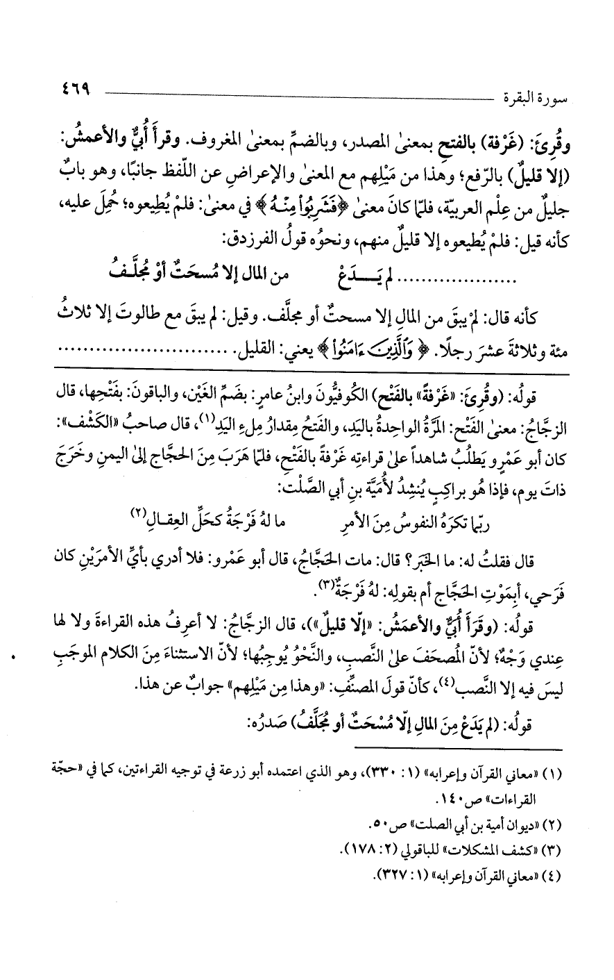 وقرئ: (غرفة) بالفتح بمعنى المصدر، وبالضم بمعنى المغروف. وقرأ أبيّ والأعمش: (إلا قليل) بالرفع؛ وهذا من ميلهم مع المعنى والإعراض عن اللفظ جانباً، وهو باب جليل من علم العربية، فلما كان معنى (فَشَرِبُوا مِنْهُ) في معنى: فلم يطيعوه؛ حمل عليه، كأنه قيل: فلم يطيعوه إلا قليل منهم، ونحوه قول الفرزدق: