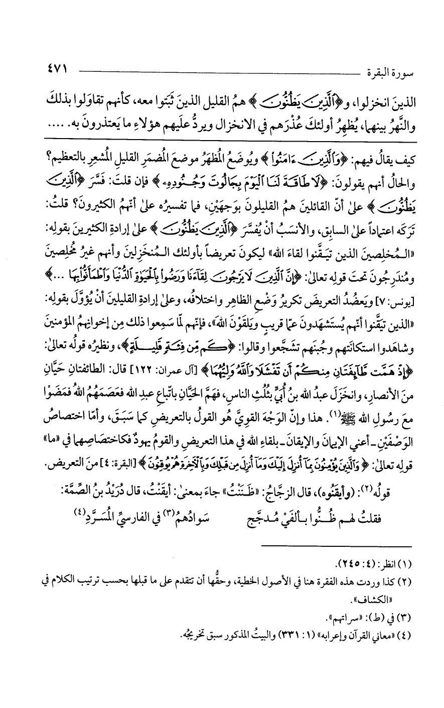 كيف يقال فيهم: (وَالَّذِينَ آمَنُوا) ويوضع المظهر موضع المضمر القليل المشعر بالتعظيم؟ والحال أنهم يقولون: (لا طَاقَةَ لَنَا الْيَوْمَ بِجَالُوتَ وَجُنُودِهِ) فإن قلت: فسر (الَّذِينَ يَظُنُّونَ) على أن القائلين هم القليلون بوجهين، فما تفسيره على أنهم الكثيرون؟ قلت: تركه اعتماداً على السابق، والأنسب أن يفسر (الَّذِينَ يَظُنُّونَ) على إرادة الكثيرين بقوله: "المخلصين الذين تيقنوا لقاء الله" ليكون تعريضاً بأولئك المنخزلين وأنهم غير مخلصين ومندرجون تحت قوله تعالى: (إِنَّ الَّذِينَ لا يَرْجُونَ لِقَاءَنَا وَرَضُوا بِالْحَيَاةِ الدُّنْيَا وَاطْمَأَنُّوا بِهَا ... ) [يونس: 7] ويعضد التعريض تكرير وضع الظاهر واختلافه، وعلى إرادة القليلين أن يؤول بقوله: "الذين تيقنوا أنهم يستشهدون عما قريب ويلقون الله"، فإنهم لما سمعوا ذلك من إخوانهم المؤمنين وشاهدوا استكانتهم وجبنهم تشجعوا وقالوا: (كَمْ مِنْ فِئَةٍ قَلِيلَةٍ)، ونظيره قوله تعالى: (إِذْ هَمَّتْ طَائِفَتَانِ مِنْكُمْ أَنْ تَفْشَلا وَاللَّهُ وَلِيُّهُمَا) [آل عمران: 122] قال: الطائفتان حيان من الأنصار، وانخزل عبد الله بن أبي بثلث الناس، فهم الحيان باتباع عبد الله فعصمهم الله فمضوا مع رسول الله صلى الله عليه وسلم. هذا وإن الوجه القوي هو القول بالتعريض كما سبق، وأما اختصاص الوصفين- أعني الإيمان والإيقان- بلقاء الله في هذا التعريض والقوم يهود فكاختصاصهما في "ما" قوله تعالى: (وَالَّذِينَ يُؤْمِنُونَ بِمَا أُنْزِلَ إِلَيْكَ وَمَا أُنْزِلَ مِنْ قَبْلِكَ وَبِالآخرَةِ هُمْ يُوقِنُونَ) [البقرة: 4] من التعريض.