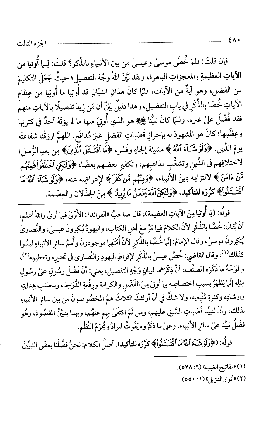 فإن قلت: فلمَ خصّ موسى وعيسى من بين الأنبياء بالذكر؟ قلت: لما أوتيا من الآيات العظيمة والمعجزات الباهرة، ولقد بين اللَّه وجه التفضيل؛ حيث جعل التكليم من الفضل، وهو آية من الآيات، فلما كان هذان النبيان قد أوتيا ما أوتيا من عظام الآيات خُصا بالذكر في باب التفضيل، وهذا دليل بين أنّ من زيد تفضيلاً بالآيات منهم فقد فضل على غيره، ولما كان نبينا صلى اللَّه عليه وسلم هو الذي أوتي منها ما لم يؤت أحد في كثرتها وعظمها؛ كان هو المشهود له بإحراز قصبات الفضل غير مدافع. اللهمّ ارزقنا شفاعته يوم الدين (وَلَوْ شاءَ اللَّهُ) مشيئة إلجاء وقسر، (مَا اقْتَتَلَ الَّذِينَ) من بعد الرسل؛ لاختلافهم في الدين وتشعب مذاهبهم، وتكفير بعضهم بعضاً، (وَلكِنِ اخْتَلَفُوا فَمِنْهُمْ مَنْ آمَنَ) لالتزامه دين الأنبياء، (وَمِنْهُمْ مَنْ كَفَرَ) لإعراضه عنه، (وَلَوْ شاءَ اللَّهُ مَا اقْتَتَلُوا) كرّره للتأكيد، (وَلكِنَّ اللَّهَ يَفْعَلُ ما يُرِيدُ) من الخذلان والعصمة.