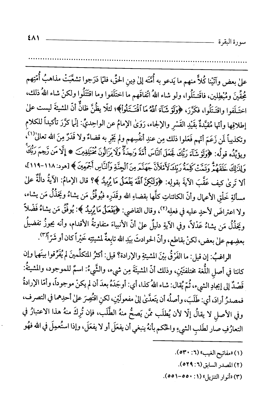 على بعض وآتينا كلاً منهم ما يدعو به أمته إلى دين الحق، فلما درجوا تشعبت مذاهب أمتهم محقين ومبطلين، فاقتتلوا، ولو شاء الله اتفاقهم ما اختلفوا وما اقتتلوا ولكن شاء الله ذلك، اختلفوا واقتتلوا، فكرر، (وَلَوْ شَاءَ اللَّهُ مَا اقْتَتَلُوا)؛ لئلا يظن ظان أن المشيئة ليست على إطلاقها وأنها مقيدة بقيد القسر والإلجاء، روى الإمام عن الواحدي: إنما كرر تأكيداً للكلام وتكذيباً لمن زعم أنهم فعلوا ذلك من عند أنفسهم ولم يجر به قضاء ولا قدر من الله تعالى، ويؤيده قوله: (وَلَوْ شَاءَ رَبُّكَ لَجَعَلَ النَّاسَ أُمَّةً وَاحِدَةً وَلا يَزَالُونَ مُخْتَلِفِينَ* إِلاَّ مَنْ رَحِمَ رَبُّكَ وَلِذَلِكَ خَلَقَهُمْ وَتَمَّتْ كَلِمَةُ رَبِّكَ لأَمْلأَنَّ جَهَنَّمَ مِنْ الْجِنَّةِ وَالنَّاسِ أَجْمَعِينَ) [هود: 118 - 119]، ألا ترى كيف عقب الآية بقوله: (وَلَكِنَّ اللَّهَ يَفْعَلُ مَا يُرِيدُ)؟ قال الإمام: الآية دالة على مسألة خلق الأعمال وأن الكائنات كلها بقضاء الله وقدره فيوفق من يشاء ويخذل من يشاء، ولا اعتراض لأحد عليه في فعله، وقال القاضي: (يَفْعَلُ مَا يُرِيدُ): يوفق من يشاء فضلاً ويخذل من يشاء عدلاً، وفي الآية دليل على أن الأنبياء متفاوتة الأقدام، وأنه يجوز تفضيل بعضهم على بعض، لكن بقاطع، وأن الحوادث بيد الله تابعة لمشيئته خيراً كان أو شراً.