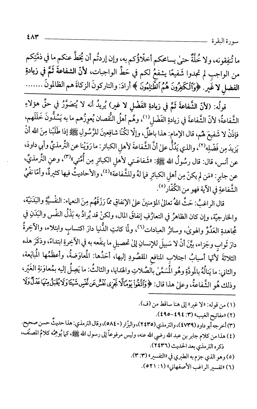 قوله: (لأن الشفاعة ثم في زيادة الفضل لا غير) يريد أنه لا يتصور في حق هؤلاء الشفاعة؛ لأن الشفاعة في زيادة الفضل، وهم أهل النقصان يعوزهم ما به يسدون خللهم، فإذن لا شفيع لهم، قال الإمام: هذا باطل، وإلا لكنا شافعين للرسول صلى الله عليه وسلم إذا طلبنا من الله أن يزيد من فضله، والذي يدل على أن الشفاعة لأهل الكبائر: ما روينا عن الترمذي وأبي داود، عن أنس، قال: قال رسول الله صلى الله عليه وسلم: "شفاعتي لأهل الكبائر من أمتي"، وعن الترمذي، عن جابر: "من لم يكن من أهل الكبائر فما له وللشفاعة"، والأحاديث فيها كثيرة، وأما نفي الشفاعة في الآية فهو من الكفار.