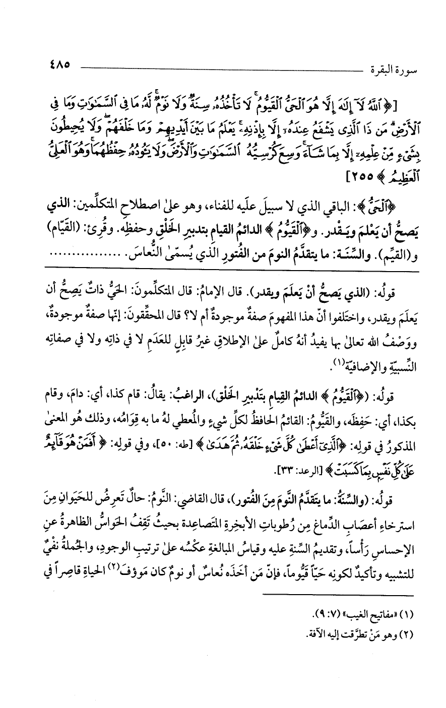 (الْحَيُّ): الباقي الذي لا سبيل عليه للفناء، وهو على اصطلاح المتكلمين: الذي يصح أن يعلم ويقدر. و (الْقَيُّومُ) الدائم القيام بتدبير الخلق وحفظه. وقرئ: (القيام) و (القيم). والسنة: ما يتقدّم النوم من الفتور الذي يسمى النعاس