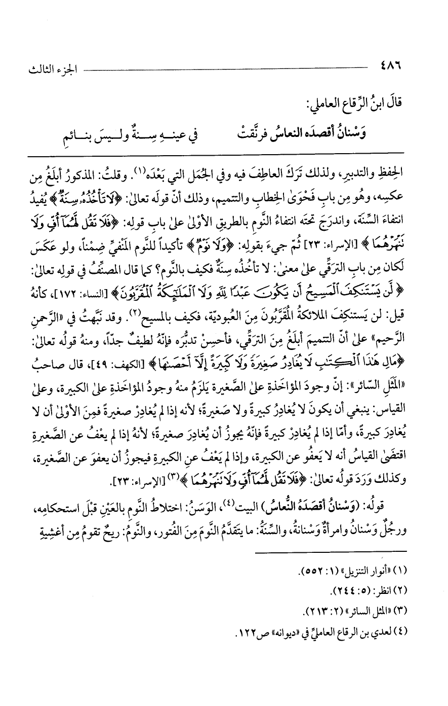 الحفظ والتدبير، ولذلك ترك العاطف فيه وفي الجمل التي بعده. وقلت: المذكور أبلغ من عكسه، وهو من باب فحوى الخطاب والتتميم، وذلك أن قوله تعالى: (لا تَاخُذُهُ سِنَةٌ) يفيد انتفاء السنة، واندرج تحته انتفاء النوم بالطريق الأولى على باب قوله: (فَلا تَقُلْ لَهُمَا أُفٍّ وَلا تَنْهَرْهُمَا) [الإسراء: 23] ثم جيء بقوله: (وَلا نَوْمٌ) تأكيداً للنوم المنفي ضمناً، ولو عكس لكان من باب الترقي على معنى: لا تأخذه سنة فكيف بالنوم؟ كما قال المصنف في قوله تعالى: (لَنْ يَسْتَنكِفَ الْمَسِيحُ أَنْ يَكُونَ عَبْداً لِلَّهِ وَلا الْمَلائِكَةُ الْمُقَرَّبُونَ) [النساء: 172]، كأنه قيل: لن يستنكف الملائكة المقربون من العبودية، فكيف بالمسيح. وقد نبهت في "الرحمن الرحيم" على أن التتميم أبلغ من الترقي، فأحسن تدبره فإنه لطيف جداً، ومنه قوله تعالى: (مَالِ هَذَا الْكِتَابِ لا يُغَادِرُ صَغِيرَةً وَلا كَبِيرَةً إِلاَّ أَحْصَاهَا) [الكهف: 49]، قال صاحب "المثل السائر": إن وجود المؤاخذة على الصغيرة يلزم منه وجود المؤاخذة على الكبيرة، وعلى القياس: ينبغي أن يكون لا يغادر كبيرة ولا صغيرة؛ لأنه إذا لم يغادر صغيرة فمن الأولى أن لا يغادر كبيرة، وأما إذا لم يغادر كبيرة فإنه يجوز أن يغادر صغيرة؛ لأنه إذا لم يعف عن الصغيرة اقتضى القياس أنه لا يعفو عن الكبيرة، وإذا لم يعف عن الكبيرة فيجوز أن يعفو عن الصغيرة، وكذلك ورد قوله تعالى: (فَلا تَقُلْ لَهُمَا أُفٍّ وَلا تَنْهَرْهُمَا) [الإسراء: 23].