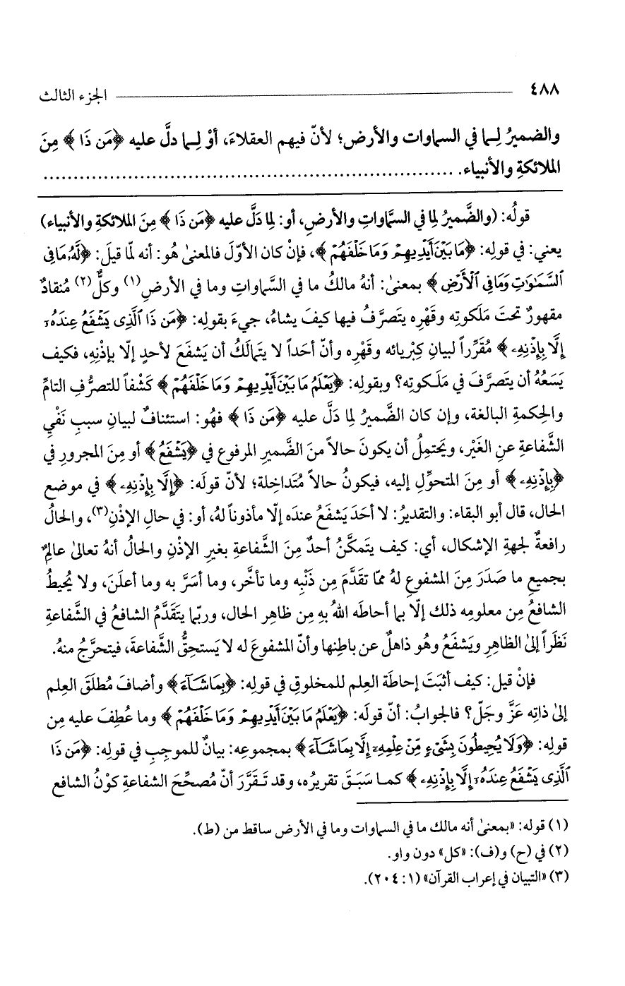 قوله: (والضمير لما في السماوات والأرض، أو: لما دل عليه (مَن ذَا) من الملائكة والأنبياء) يعني: في قوله: (مَا بَيْنَ أَيْدِيهِمْ وَمَا خَلْفَهُمْ)، فإن كان الأول فالمعنى هو: أنه لما قيل: (لَهُ مَا فِي السَّمَوَاتِ وَمَا فِي الأَرْضِ) بمعنى: أنه مالك ما في السماوات وما في الأرض وكل منقاد مقهور تحت ملكوته وقهره يتصرف فيها كيف يشاء، جيء بقوله: (مَنْ ذَا الَّذِي يَشْفَعُ عِنْدَهُ إِلاَّ بِإِذْنِهِ) مقرراً لبيان كبريائه وقهره وأن أحداً لا يتمالك أن يشفع لأحد إلا بإذنه، فكيف يسعه أن يتصرف في ملكوته؟ وبقوله: (يَعْلَمُ مَا بَيْنَ أَيْدِيهِمْ وَمَا خَلْفَهُمْ) كشفاً للتصرف التام والحكمة البالغة، وإن كان الضمير لما دل عليه (مَن ذَا) فهو: استئناف لبيان سبب نفي الشفاعة عن الغير، ويحتمل أن يكون حالاً من الضمير المرفوع في (يَشْفَعُ) أو من المجرور في (بِإِذْنِهِ) أو من المتحول إليه، فيكون حالاً متداخلة؛ لأن قوله: (إِلاَّ بِإِذْنِهِ) في موضع الحال، قال أبو البقاء: والتقدير: لا أحد يشفع عنده إلا مأذوناً له، أو: في حال الإذن، والحال رافعة لجهة الإشكال، أي: كيف يتمكن أحد من الشفاعة بغير الإذن والحال أنه تعالى عالم بجميع ما صدر من المشفوع له مما تقدم من ذنبه وما تأخر، وما أسر به وما أعلن، ولا يحيط الشافع من معلومه ذلك إلا بما أحاطه الله به من ظاهر الحال، وربما يتقدم الشافع في الشفاعة نظراً إلى الظاهر ويشفع وهو ذاهل عن باطنها وأن المشفوع له لا يستحق الشفاعة، فيتحرج منه.