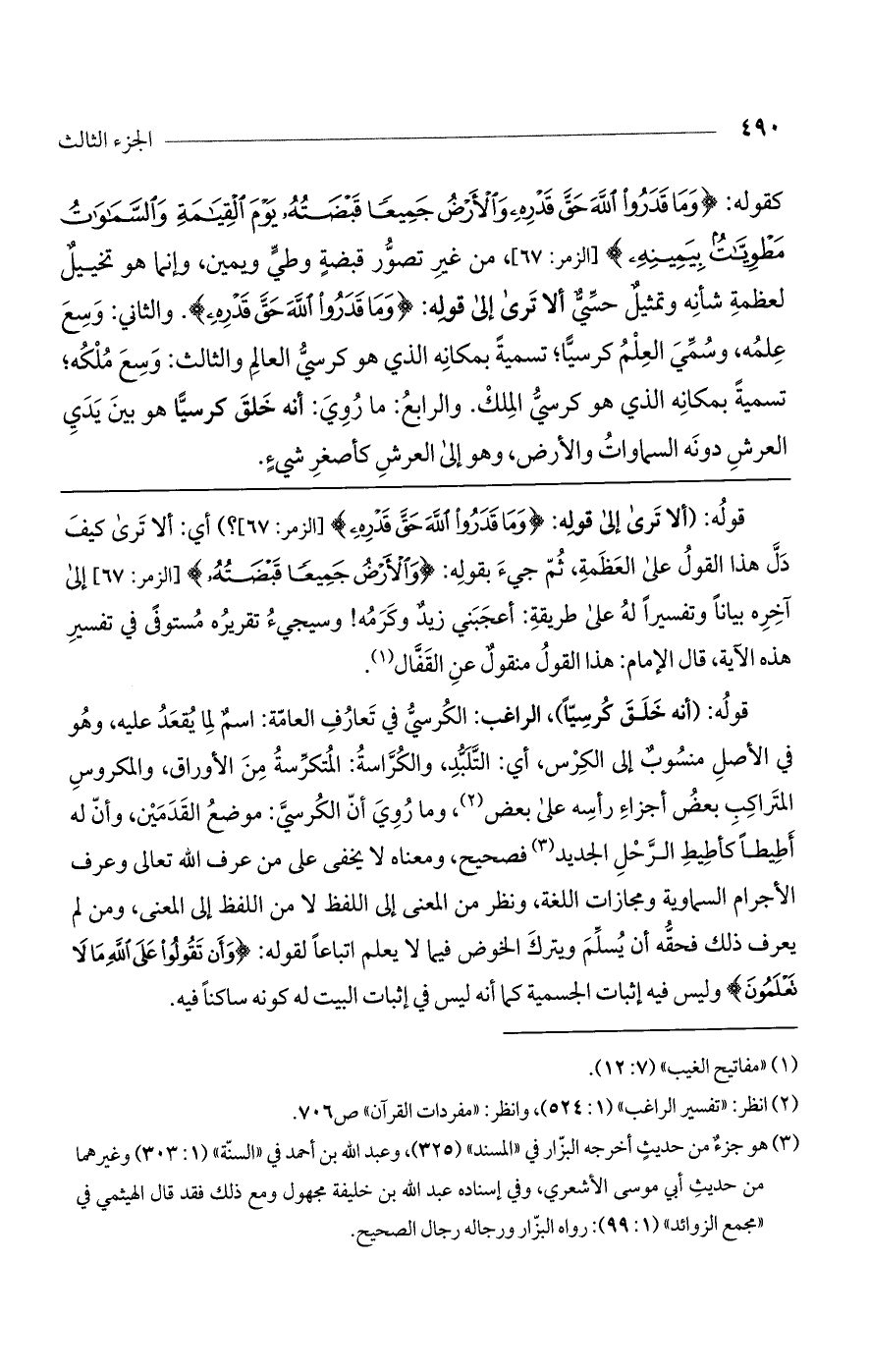 كقوله: (وَما قَدَرُوا اللَّهَ حَقَّ قَدْرِهِ وَالْأَرْضُ جَمِيعاً قَبْضَتُهُ يَوْمَ الْقِيامَةِ وَالسَّماواتُ مَطْوِيَّاتٌ بِيَمِينِهِ) [الزمر: 67]، من غير تصوّر قبضة وطيّ ويمين، وإنما هو تخييل لعظمة شأنه وتمثيل حسيّ ألا ترى إلى قوله: (وَما قَدَرُوا اللَّهَ حَقَّ قَدْرِهِ). والثاني: وسع علمه وسمي العلم كرسياً؛ تسميةً بمكانه الذي هو كرسي العالم والثالث: وسع ملكه؛ تسمية بمكانه الذي هو كرسي الملك. والرابع: ما روي: أنه خلق كرسياً هو بين يدي العرش دونه السموات والأرض، وهو إلى العرش كأصغر شيء.