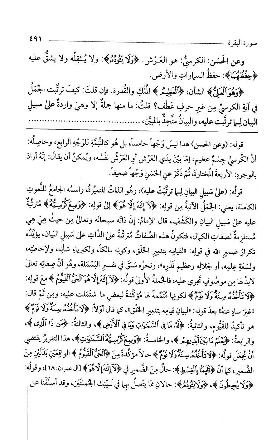قوله: (على سبيل البيان لما ترتبت عليه)، وهو الذات المتميزة، واسمه الجامع للنعوت الكاملة، يعني: الجمل الآتية من قوله: (لا إِلَهَ إِلاَّ هُوَ) إلى قوله: (وَسِعَ كُرْسِيُّهُ) مترتبة عليه على سبيل البيان والكشف، قال الإمام: إن ذاته سبحانه وتعالى من حيث هي هي مستلزمة لصفات الكمال، فتكون هذه الصفات مترتبة على الذات على سبيل البيان، يؤيده تكرار ضمير الله في قوله: "لقيامه بتدبير الخلق، وكونه مالكاً، ولكبرياء شأنه، ولإحاطته، ولسعة علمه، أو لجلاله وعظيم قدره"، ونحوه سبق في تفسير البسملة، وهو أن صفاته تعالى لابد لها من موصوف تجري عليه، فالجملة الأولى قوله: (لا إِلَهَ إِلاَّ هُوَ الْحَيُّ الْقَيُّومُ) مع قوله: (لا تَاخُذُهُ سِنَةٌ وَلا نَوْمٌ) لكونها متممة لها مؤكدة لبعض ما اشتملت عليه، ومن ثم قال: "غير ساه عنه" بعد قوله: "لبيان قيامه بتدبير الخلق"، كما قال أولاً: (لا تَاخُذُهُ سِنَةٌ وَلا نَوْمٌ) هو تأكيد للقيوم، والثانية: (لَهُ مَا فِي السَّمَوَاتِ وَمَا فِي الأَرْضِ)، والثالثة: (مَنْ ذَا الَّذِي)، والرابعة: (يَعْلَمُ مَا بَيْنَ أَيْدِيهِمْ)، والخامسة: (وَسِعَ كُرْسِيُّهُ السَّمَوَاتِ)، هذا التقرير يقتضي أن يجعل قوله: (لا تَاخُذُهُ سِنَةٌ وَلا نَوْمٌ) حالاً مؤكدة من (الْحَيُّ الْقَيُّومُ) الواقعين بدلين من الضمير، كما أن (قَائِماً بِالْقِسْطِ): حال من الضمير في (لا إِلَهَ إِلاَّ هُوَ) [آل عمران: 18]، وقوله: (وَلا يُحِيطُونَ)، (وَلا يَئُودُهُ): حالان مما يتصل بهما في تينك الجملتين، وقد أسلفنا عن