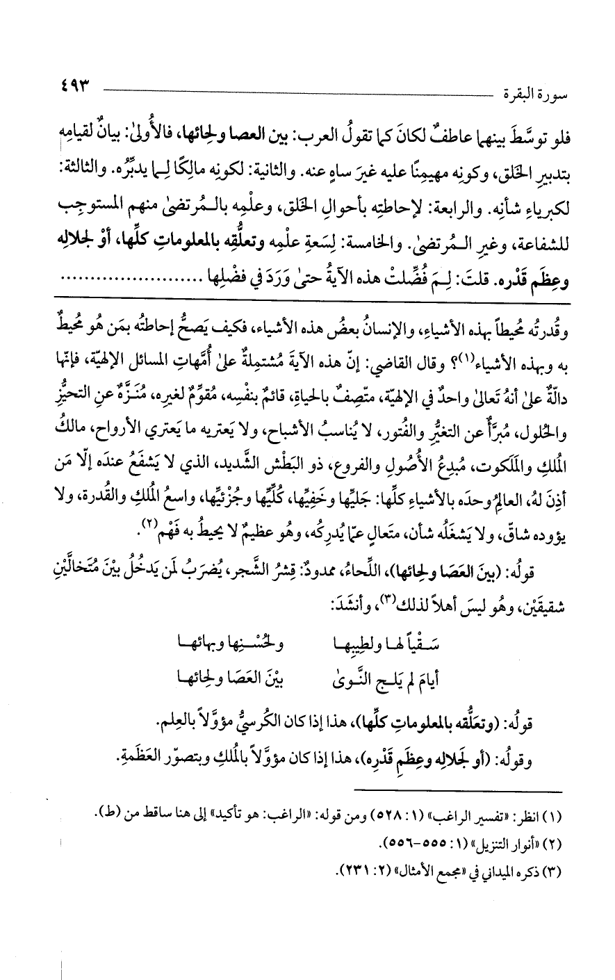 فلو توسط بينهما عاطف لكان كما تقول العرب: بين العصا ولحائها، فالأولى: بيان لقيامه بتدبير الخلق، وكونه مهيمناً عليه غير ساهٍ عنه. والثانية: لكونه مالكاً لما يدبره. والثالثة: لكبرياء شأنه. والرابعة: لإحاطته بأحوال الخلق، وعلمه بالمرتضى منهم المستوجب للشفاعة، وغير المرتضى. والخامسة: لسعة علمه وتعلقه بالمعلومات كلها، أو لجلاله وعظم قدره. قلت: لم فضلت هذه الآية حتى ورد في فضلها
