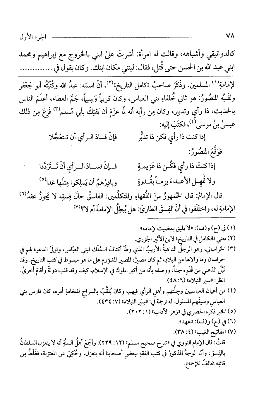 لإمامة المسلمين. وذكر صاحب "كامل التاريخ"، أن اسمه: عبد الله وكنيته أبو جعفر ولقبه المنصور: هو ثاني خلفاء بني العباس، وكان كريماً وسيماً، جم العطاء، أعلم الناس بالحديث، ذا رأي وتدبير، وكان من رأيه أنه لما عزم أن يفتك بأبي مسلم فزع من ذلك عيسى بن موسى، فكتب إليه: