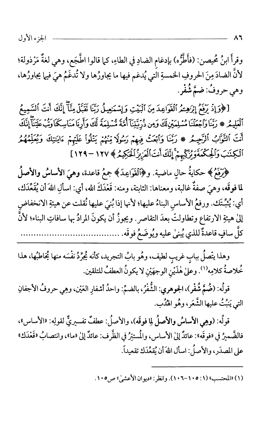 (يَرْفَعُ) حكاية حال ماضية. و (الْقَوَاعِدَ) جمع قاعدة، وهي الأساس والأصل لما فوقه، وهي صفة غالبة، ومعناها: الثابتة، ومنه: قعدك الله، أي: اسأل الله أن يقعدك، أي: يثبتك. ورفع الأساس البناء عليها؛ لأنها إذا بني عليها نقلت عن هيئة الانخفاض إلى هيئة الارتفاع وتطاولت بعد التقاصر. ويجوز أن يكون المراد بها سافات البناء؛ لأن كل ساف قاعدة للذي يبنى عليه ويوضع فوقه