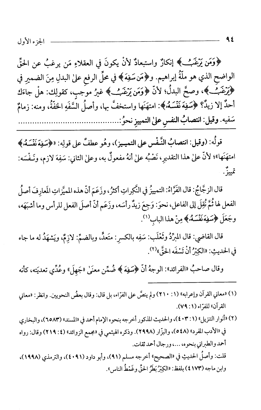 (وَمَنْ يَرْغَبُ) إنكار واستبعاد لأن يكون في العقلاء من يرغب عن الحق الواضح الذي هو ملة إبراهيم. و (مَنْ سَفِهَ) في محل الرفع على البدل من الضمير في (يَرْغَبُ)، وصح البدل؛ لأن (وَمَنْ يَرْغَبُ) غير موجب، كقولك: هل جاءك أحد إلا زيد؟ (سَفِهَ نَفْسَهُ): امتهنها واستخف بها، وأصل السفه الخفة، ومنه: زمام سفيه. وقيل: انتصاب النفس على التمييز نحو: