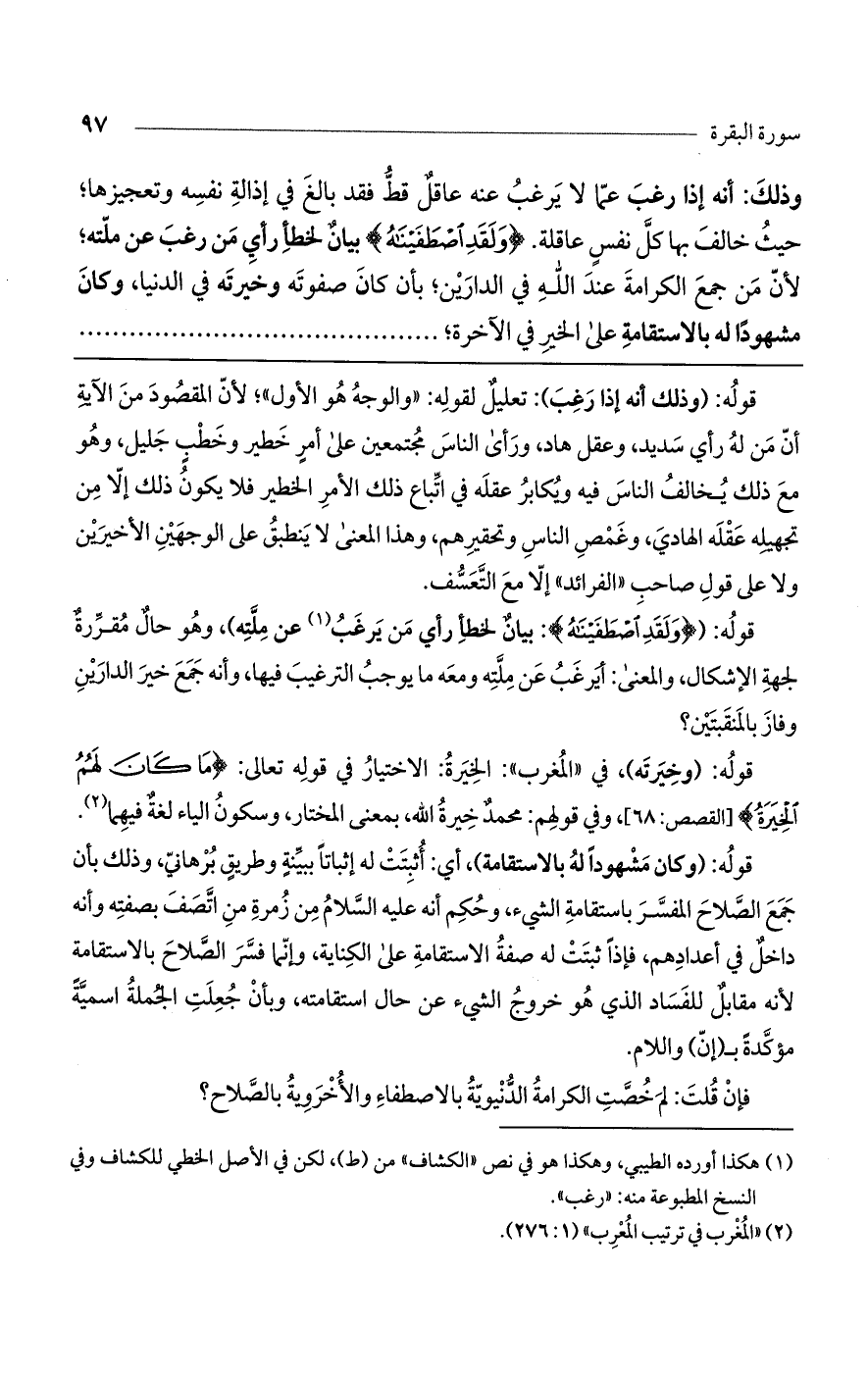 قوله: (وَلَقَدْ اصْطَفَيْنَاهُ): بيان لخطأ رأي من يرغب عن ملته)، وهو حال مقررة لجهة الإشكال، والمعنى: أيرغب عن ملته ومعه ما يوجب الترغيب فيها، وأنه جمع خير الدارين وفاز بالمنقبتين؟