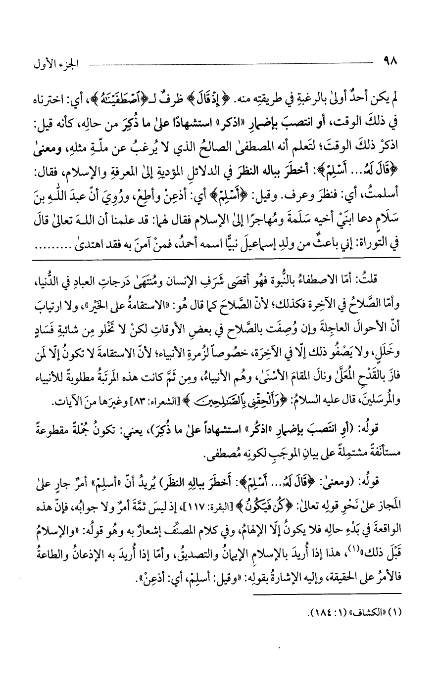 لم يكن أحد أولى بالرغبة في طريقته منه. (إِذْ قَالَ) ظرف لـ (اصْطَفَيْنَاهُ)، أي: اخترناه في ذلك الوقت، أو انتصب بإضمار "اذكر" استشهاداً على ما ذكر من حاله، كأنه قيل: اذكر ذلك الوقت؛ لتعلم أنه المصطفى الصالح الذي لا يرغب عن ملة مثله، ومعنى (قَالَ لَهُ .... أَسْلِمْ): أخطر بباله النظر في الدلائل المؤدية إلى المعرفة والإسلام، فقال: أسلمت، أي: فنظر وعرف. وقيل: (أَسْلِمْ) أي: أذعن وأطع، وروي أن عبد الله بن سلام دعا ابني أخيه سلمة ومهاجراً إلى الإسلام فقال لهما: قد علمنا أن الله تعالى قال في التوراة: إني باعث من ولد إسماعيل نبياً اسمه أحمد، فمن آمن به فقد اهتدى