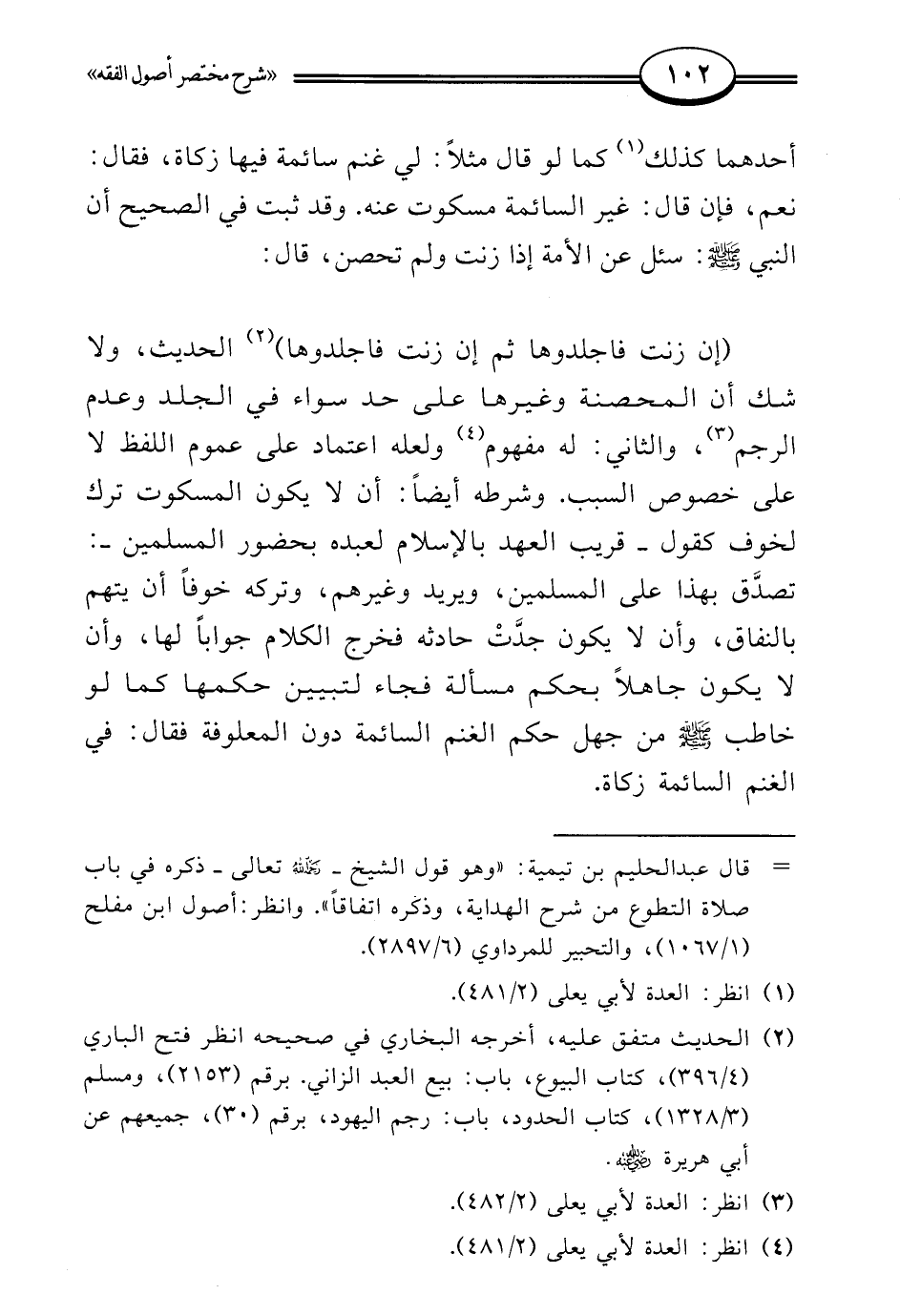 (إن زنت فاجلدوها ثم إن زنت فاجلدوها) (¬2) الحديث، ولا شك أن المحصنة وغيرها على حد سواء في الجلد وعدم الرجم (¬3)، والثاني: له مفهوم (¬4) ولعله اعتماد على عموم اللفظ لا على خصوص السبب. وشرطه أيضًا: أن لا يكون المسكوت ترك لخوف كقول -قريب العهد بالإسلام لعبده بحضور المسلمين-: تصدَّق بهذا على المسلمين، ويريد وغيرهم، وتركه خوفًا أن يتهم بالنفاق، وأن لا يكون جدَّتْ حادثه فخرج الكلام جوابًا لها، وأن لا يكون جاهلًا بحكم مسألة فجاء لتبيين حكمها كما لو خاطب - صلى الله عليه وسلم - من جهل حكم الغنم السائمة دون المعلوفة فقال: في الغنم السائمة زكاة.