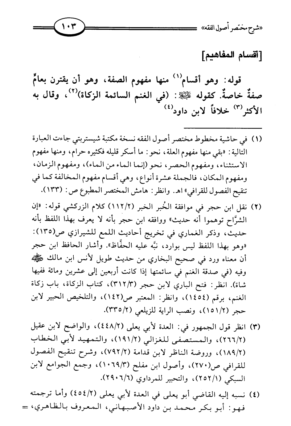 (¬1) في حاشية مخطوط مختصر أصول الفقه نسخة مكتبة شيستربتي جاءت العبارة التالية: "بقي منها مفهوم العلة، نحو: ما أسكر قليله فكثيره حرام، ومنها مفهوم الاستثناء، ومفهوم الحصر، نحو (إنما الماء من الماء)، ومفهوم الزمان، ومفهوم المكان، فالجملة عشرة أنواع، وهي أقسام مفهوم المخالفة كما في تنقيح الفصول للقرافي" اهـ. وانظر: هامش المختصر المطبوع ص: (133).