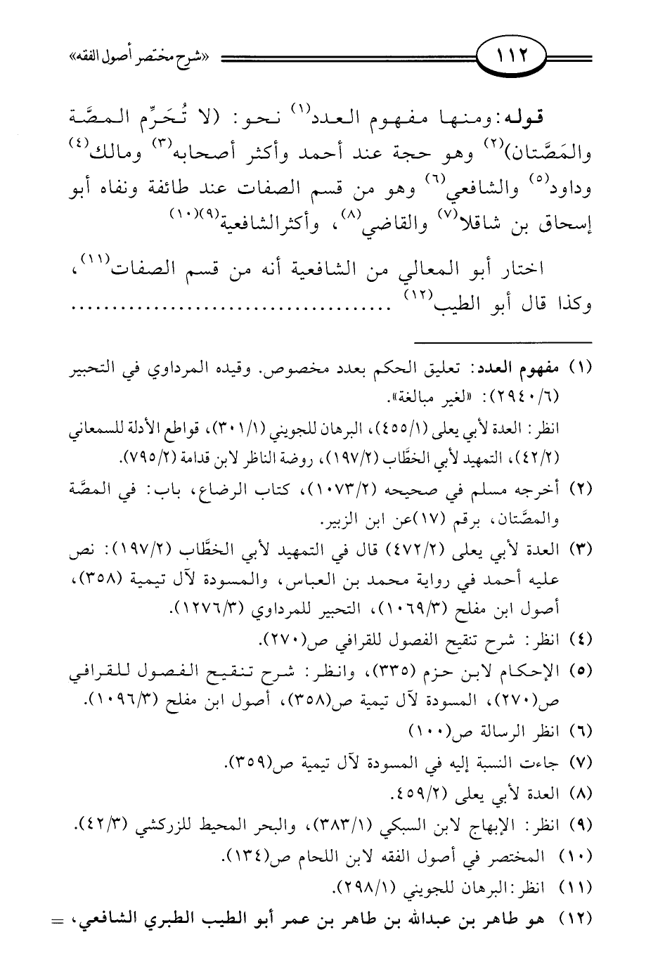 قوله: ومنها مفهوم العدد (¬1) نحو: (لا تُحَرِّم المصَّة والمَصَّتان) (¬2) وهو حجة عند أحمد وأكثر أصحابه (¬3) ومالك (¬4) وداود (¬5) والشافعي (¬6) وهو من قسم الصفات عند طائفة ونفاه أبو إسحاق بن شاقلا (¬7) والقاضي (¬8)، وأكثر الشافعية (¬9) (¬10).