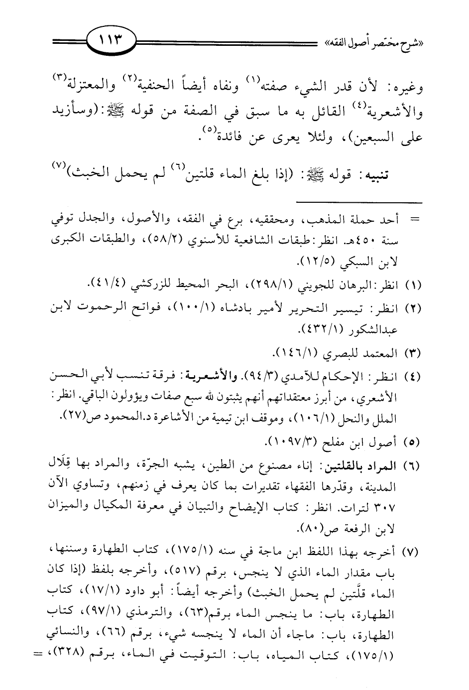 (¬6) المراد بالقلتين: إناء مصنوع من الطين، يشبه الجرّة، والمراد بها قِلَال المدينة، وقدّرها الفقهاء تقديرات بما كان يعرف في زمنهم، وتساوي الآن 307 لترات. انظر: كتاب الإيضاح والتبيان في معرفة المكيال والميزان لابن الرفعة ص (80).