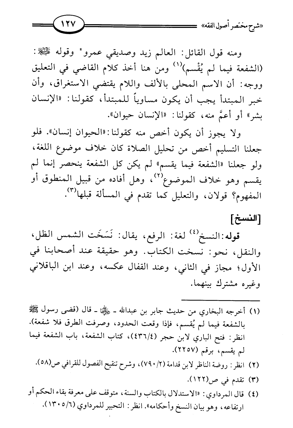 (¬4) قال المرداوي: "الاستدلال بالكتاب والسنة، متوقف على معرفة بقاء الحكم أو ارتفاعه، وهو بيان النسخ وأحكامه". انظر: التحبير للمرداوي (6/ 1305).
