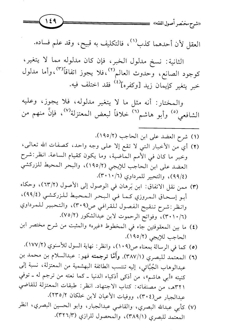 (¬6) المعتمد للبصري (1/ 387). وأَمَّا ترجمته فهو: عبد السلام بن محمد بن عبد الوهاب الجُبَّائي، إليه تنتسب الطائفة البهشمية من المعتزلة، نسبة إلى كنيته "أبي هاشم"، من أذكى أذكياء الدنيا -كما نعته من ترجم له- توفي 321 هـ، من مصنفاته: كتاب الاجتهاد. انظر: طبقات المعتزلة للقاضي عبد الجبار ص (304)، ووفيات الأعيان لابن خلكان 2/ 235).