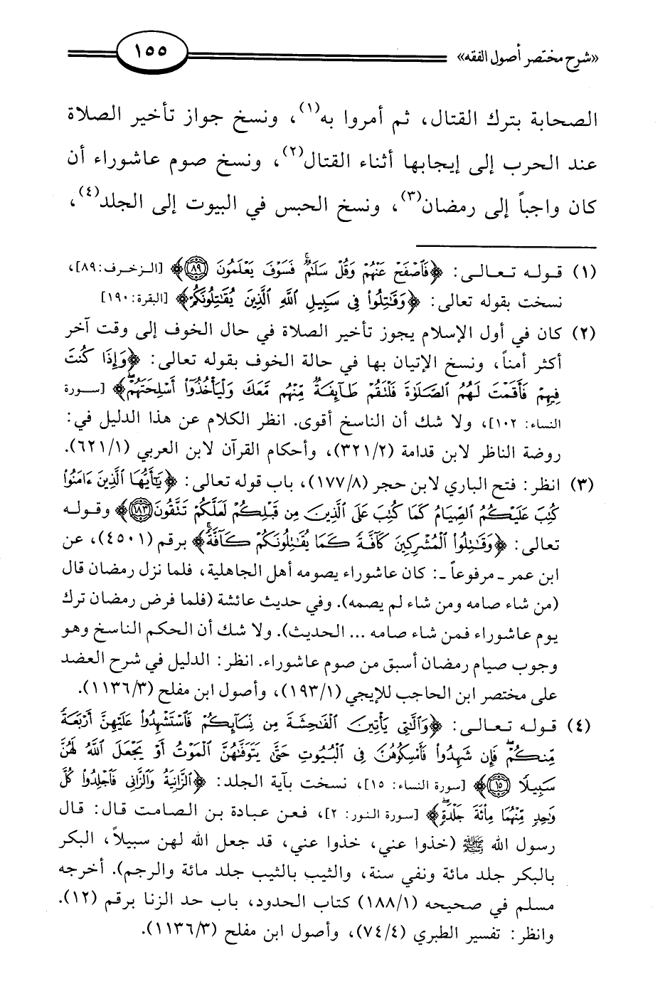 (¬3) انظر: فتح الباري لابن حجر (8/ 177)، باب قوله تعالى: {يَاأَيُّهَا الَّذِينَ آمَنُوا كُتِبَ عَلَيْكُمُ الصِّيَامُ كَمَا كُتِبَ عَلَى الَّذِينَ مِنْ قَبْلِكُمْ لَعَلَّكُمْ تَتَّقُونَ (183)} وقوله تعالى: {وَقَاتِلُوا الْمُشْرِكِينَ كَافَّةً كَمَا يُقَاتِلُونَكُمْ كَافَّةً} برقم (4501)، عن ابن عمر -مرفوعًا-: كان عاشوراء يصومه أهل الجاهلية، فلما نزل رمضان قال (من شاء صامه ومن شاء لم يصمه). وفي حديث عائشة (فلما فرض رمضان ترك يوم عاشوراء فمن شاء صامه ... الحديث). ولا شك أن الحكم الناسخ وهو وجوب صيام رمضان أسبق من صوم عاشوراء. انظر: الدليل في شرح العضد على مختصر ابن الحاجب للإيجي (1/ 193)، وأصول ابن مفلح (3/ 136).