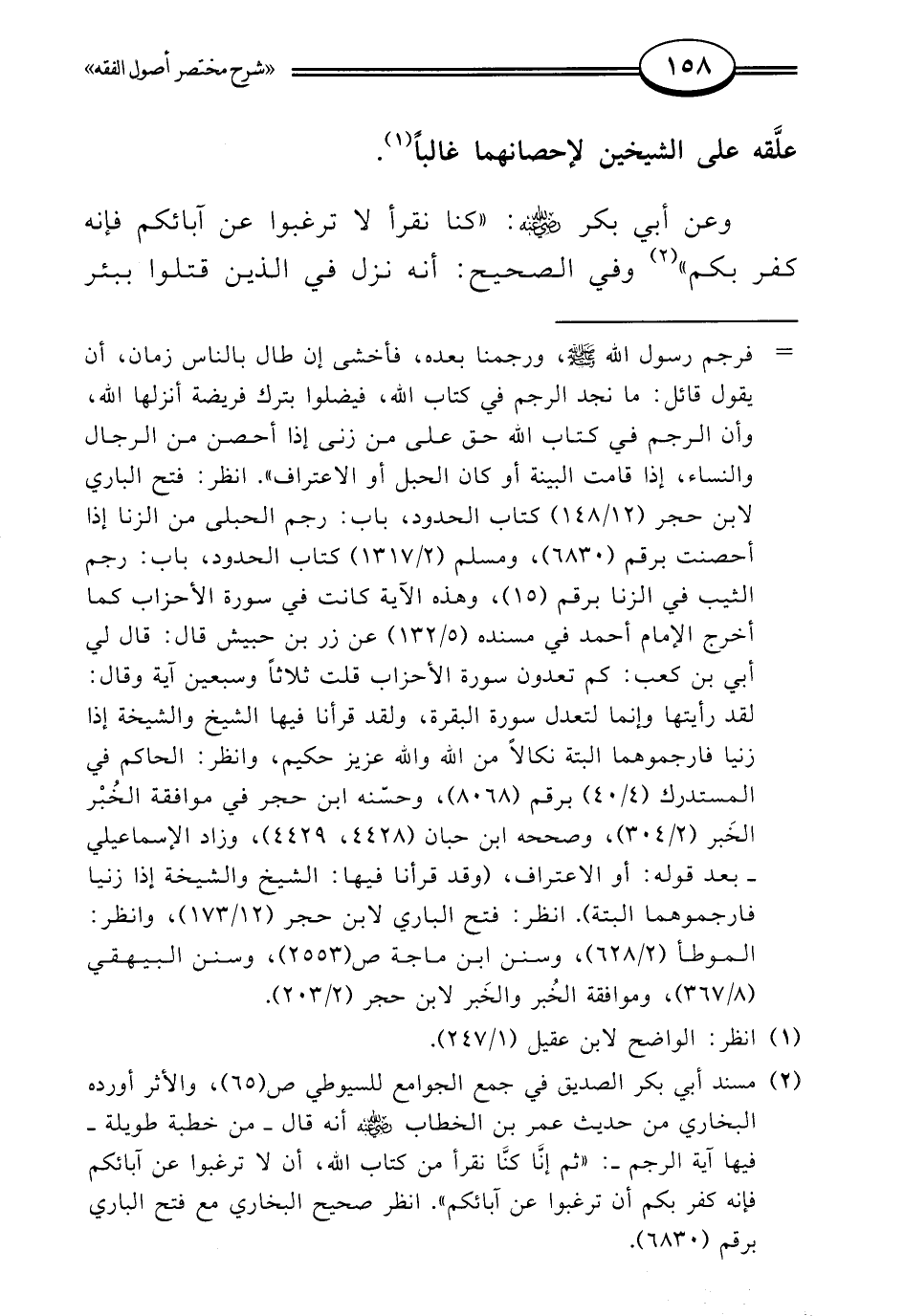 = فرجم رسول الله -صلى الله عليه وسلم-، ورجمنا بعده، فأخشى إن طال بالناس زمان، أن يقول قائل: ما نجد الرجم في كتاب الله، فيضلوا بترك فريضة أنزلها الله، وأن الرجم في كتاب الله حق على من زنى إذا أحصن من الرجال والنساء، إذا قامت البينة أو كان الحبل أو الاعتراف". انظر: فتح الباري لابن حجر (12/ 148) كتاب الحدود، باب: رجم الحبلى من الزنا إذا أحصنت برقم (6830)، ومسلم (2/ 1317) كتاب الحدود، باب: رجم الثيب في الزنا برقم (15)، وهذه الآية كانت في سورة الأحزاب كما أخرج الإمام أحمد في مسنده (5/ 132) عن زر بن حبيش قال: قال لي أبي بن كعب: كم تعدون سورة الأحزاب قلت ثلاثًا وسبعين آية وقال: لقد رأيتها وإنما لتعدل سورة البقرة، ولقد قرأنا فيها الشيخ والشيخة إذا زنيا فارجموهما البتة نكالًا من الله والله عزيز حكيم، وانظر: الحاكم في المستدرك (4/ 40) برقم (8068)، وحسّنه ابن حجر في موافقة الخُبْر الخَبر (2/ 304)، وصححه ابن حبان (4428، 4429)، وزاد الإسماعيلي - بعد قوله: أو الاعتراف، (وقد قرأنا فيها: الشيخ والشيخة إذا زنيا فارجموهما البتة). انظر: فتح الباري لابن حجر (12/ 173)، وانظر: الموطأ (2/ 628)، وسنن ابن ماجة ص (2553)، وسنن البيهقي (8/ 367)، وموافقة الخُبر والخَبر لابن حجر (2/ 203).