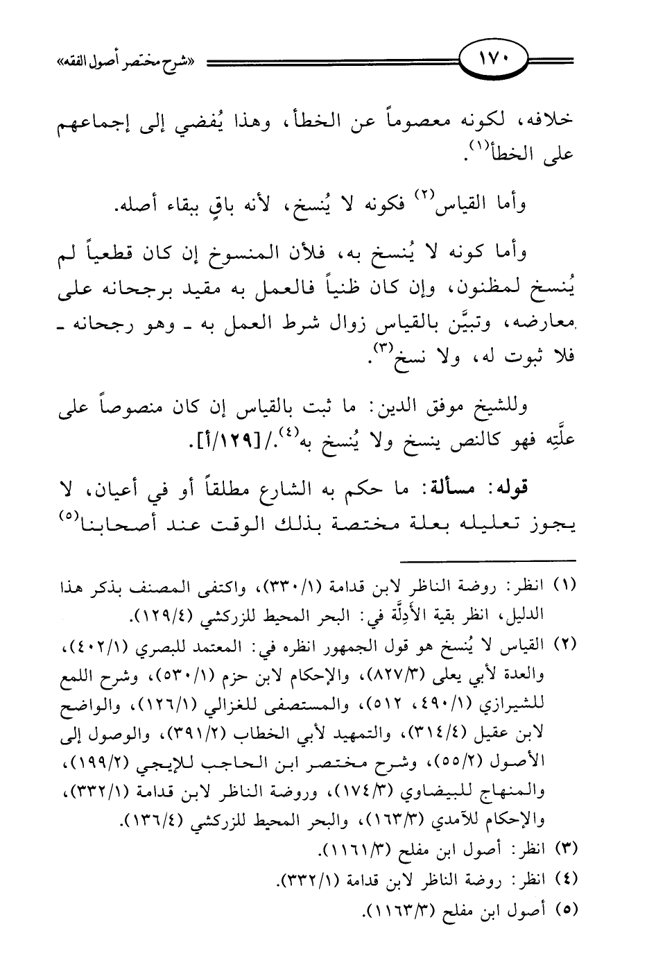 (¬2) القياس لا يُنسخ هو قول الجمهور انظره في: المعتمد للبصري (1/ 402)، والعدة لأبي يعلى (3/ 827)، والإحكام لابن حزم (1/ 530)، وشرح اللمع للشيرازي (1/ 490، 512)، والمستصفى للغزالي (1/ 126)، والواضح لابن عقيل (4/ 314)، والتمهيد لأبي الخطاب (2/ 391)، والوصول إلى الأصول (2/ 55)، وشرح مختصر ابن الحاجب للإيجي (2/ 199)، والمنهاج للبيضاوي (3/ 174)، وروضة الناظر لابن قدامة (1/ 332)، والإحكام للآمدي (3/ 163)، والبحر المحيط للزركشي (4/ 136).