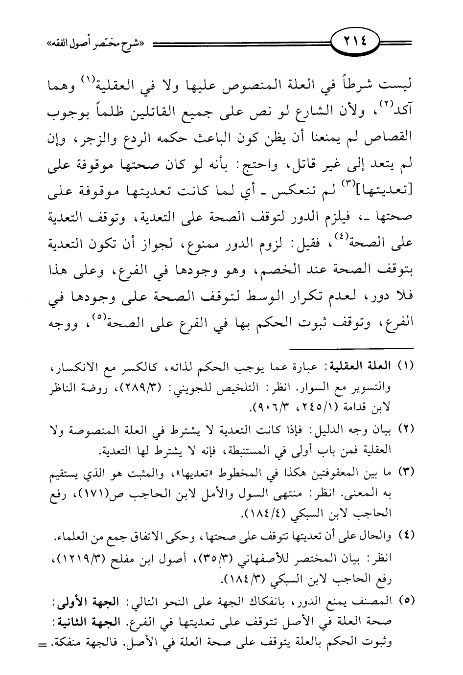 (¬1) العلة العقلية: عبارة عما يوجب الحكم لذاته، كالكسر مع الانكسار، والتسوير مع السوار. انظر: التلخيص للجويني: (3/ 289)، روضة الناظر لابن قدامة (1/ 245، 3/ 906).