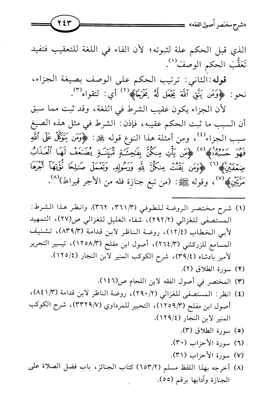 لأن الجزاء يكون عقيب الشرط في اللغة، وقد ثبت مما سبق أن السبب ما ثبت الحكم عقيبه، فإذن: الشرط في مثل هذه الصيغ سبب الجزاء (¬4)، ومن أمثلة هذا النوع قوله عز وجل: {وَمَنْ يَتَوَكَّلْ عَلَى اللَّهِ فَهُوَ حَسْبُهُ} (¬5) {مَنْ يَأْتِ مِنْكُنَّ بِفَاحِشَةٍ مُبَيِّنَةٍ يُضَاعَفْ لَهَا الْعَذَابُ ضِعْفَيْنِ} (¬6) {وَمَنْ يَقْنُتْ مِنْكُنَّ لِلَّهِ وَرَسُولِهِ وَتَعْمَلْ صَالِحًا نُؤْتِهَا أَجْرَهَا مَرَّتَيْنِ} (¬7)، وقوله - صلى الله عليه وسلم -: (من تبع جنازة فله من الأجر قيراط) (¬8).