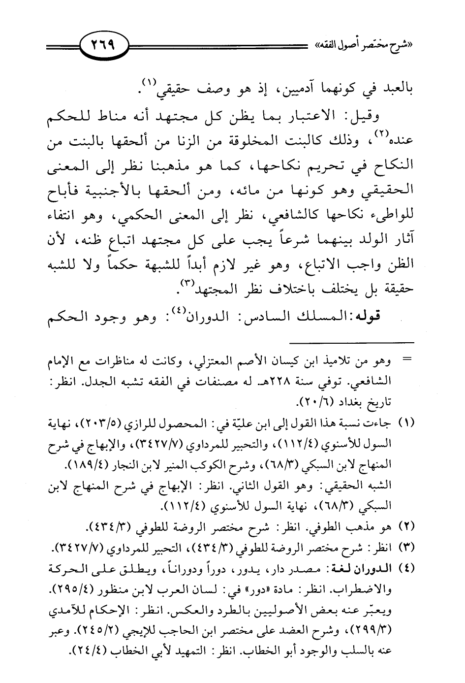 (¬4) الدوران لغة: مصدر دار، يدور، دورًا ودورانًا، ويطلق على الحركة والاضطراب. انظر: مادة "دور" في: لسان العرب لابن منظور (4/ 295). ويعبّر عنه بعض الأصوليين بالطرد والعكس. انظر: الإحكام للآمدي (3/ 299)، وشرح العضد على مختصر ابن الحاجب للإيجي (2/ 245). وعبر عنه بالسلب والوجود أبو الخطاب. انظر: التمهيد لأبي الخطاب (4/ 24).